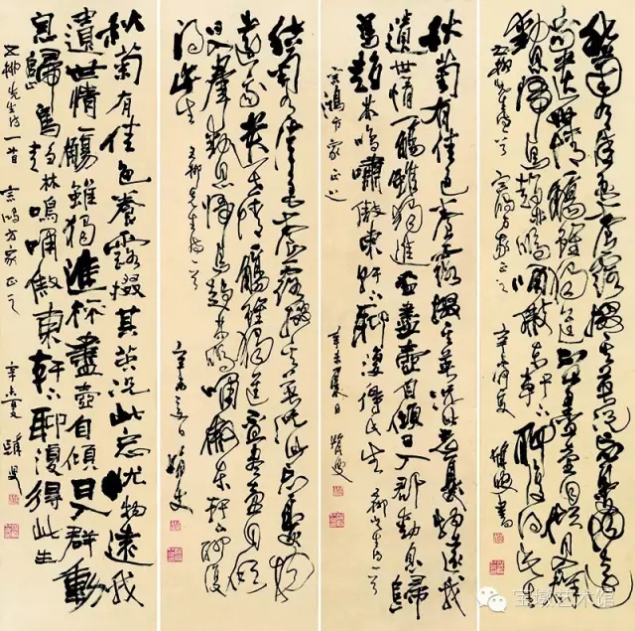 倪老一生將生命托付給書(shū)法藝術(shù),即能超絕時(shí)流,既在經(jīng)典傳統(tǒng)中睹往思今騰擲翻翥爛熟于心手,又能以此為基用不羈的創(chuàng)造力去開(kāi)拓一片新的天地。他的書(shū)法藝術(shù)筑基穩(wěn)厚,同時(shí)自出機(jī)杼發(fā)之以狂,狂而隨心所欲愈于規(guī)矩之外,法度之內(nèi)易就,逸出法度之外難,逸出于法度之外而能隨已情性,在狂中達(dá)到高度的藝術(shù)性是難上加難。因那是進(jìn)入了自然變化的天則,即天人合一的境界。先生時(shí)在壬申(1992年)六十七歲,客寓門(mén)生楊宗鴻家。正值春風(fēng)鼓蕩萬(wàn)物復(fù)甦,心情非常爽清安和,漫步于唐風(fēng)宋韻詩(shī)詞之中,有所感即提筆揮毫任其興之所至。其中真、草、隸、篆、行五體皆備,充分顯現(xiàn)了先生書(shū)藝功底之厚。特別是大篆《浪淘沙》(《倪為公書(shū)毛澤東詩(shī)詞四十八首》)一幅,得上古三代吉金文字之精良純粹,從用筆到章法自然天成,無(wú)斧鑿之痕跡,蒼古韻趣撲面而來(lái),從中可窺探倪老狂草線(xiàn)條所由出。眾多篇幅的小楷、小行楷得晉人遺韻,結(jié)體空靈點(diǎn)畫(huà)斑斕。在行草書(shū)中可味出懷素到王鐸的眾多消息。這一切正是他博觀約取搜妙探奇的最好印證。在這些字體幅面不大的作品中,書(shū)法線(xiàn)條還蘊(yùn)含著鹓鴻戲海百盤(pán)九折的韻趣。由于書(shū)者立意沉粹加上蕭散灑落心境,理法時(shí)逸出前人,位置非穩(wěn),發(fā)前人所未發(fā),但正是這天真爛漫具有煜煜射人之境界。