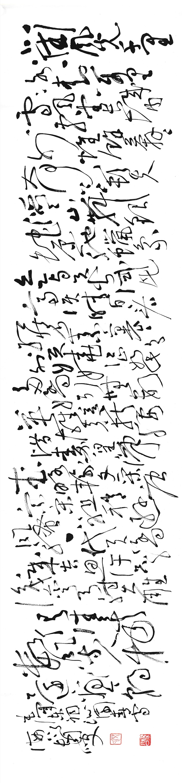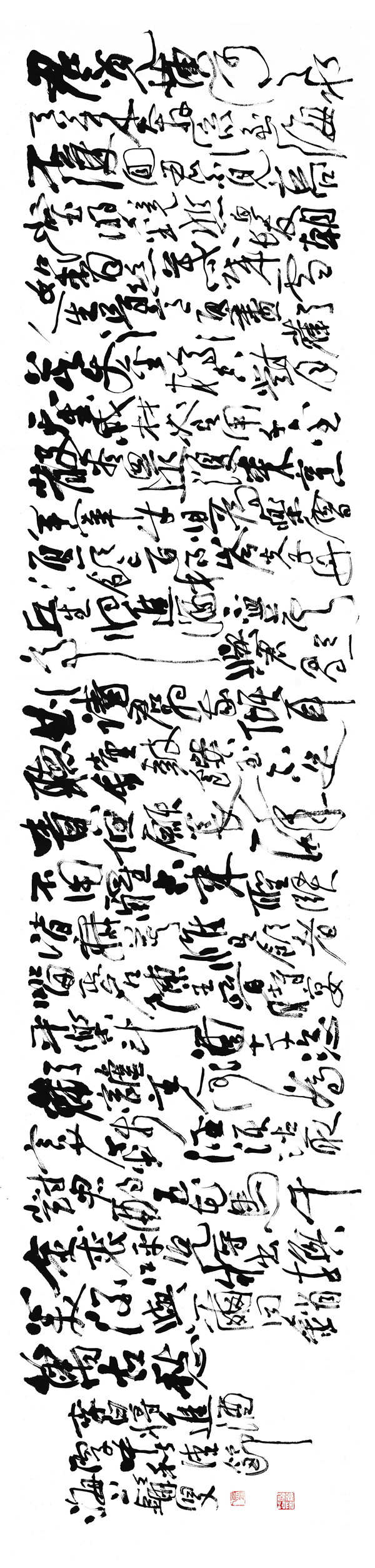 倪老晚年更加沉浸于大草,將一生不羈之創(chuàng)造力投入其中。他的大草大概可分為二類(lèi):一類(lèi)線(xiàn)條粗獷,握管使鋒落筆如暴風(fēng)驟雨,章法彌滿(mǎn),時(shí)有漲墨如交響樂(lè)之重低音,使整個(gè)幅面構(gòu)成更加跌宕起伏,如雷轟電激感心動(dòng)目。另一類(lèi)為游絲草,如輕音樂(lè)般地意動(dòng)旋機(jī),援毫掣動(dòng)中鋒行走爐火純青,婉轉(zhuǎn)自如清澈順暢,氤氳飄渺以柔克剛。似清煙水墨,似天上游絲之云,給人時(shí)有天外之想。章法亂石鋪路隨其所應(yīng),點(diǎn)畫(huà)與點(diǎn)畫(huà)之間字與字之間鑲嵌得天衣無(wú)縫節(jié)奏分明。如光明之鏡界,這即是書(shū)仙凝煉成的清寂透澈的藝術(shù)境界。
