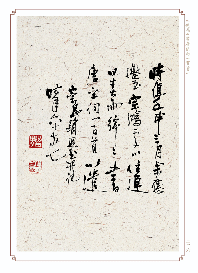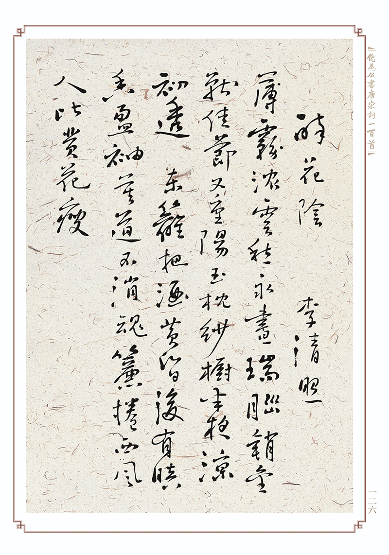 先生創(chuàng)作此一百首唐宋詞書(shū)法作品,時(shí)維壬申三月?;蒿L(fēng)和暢,春和景明。先生那時(shí)六十方七,精力旺盛,氣爽神清。按上海古藉出版社一九七八年版《唐宋詞一百首》書(shū)寫(xiě),據(jù)詞意以揮毫,依詞境而潑墨。心手雙暢,幅幅精妙,直令人欲歌欲舞,擊節(jié)拍案。