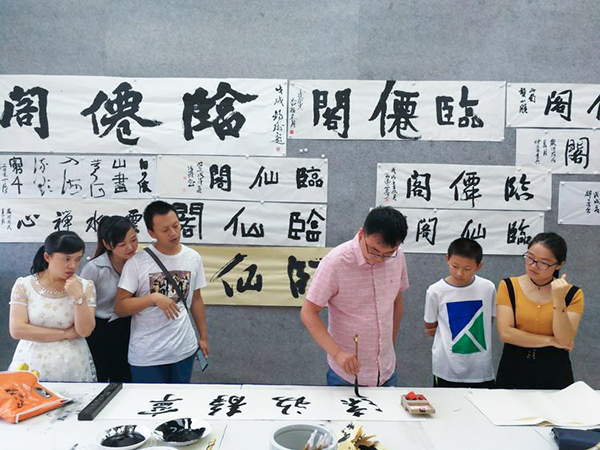 學(xué)員們在市一醫(yī)院工會主席郝維華的帶領(lǐng)下,參觀了市書協(xié)河?xùn)|臨仙閣創(chuàng)作基地,登上臨仙閣,學(xué)習(xí)了書法家們的作品,進(jìn)一步感受了書法的藝術(shù)魅力并欣賞了遂寧的涪江美景!參觀結(jié)束后,在陳剛、聶兆科、趙虎、楊慶等老師的指導(dǎo)下又靜心體悟了筆法、交流各自心得!老師們現(xiàn)場書寫作品贈予學(xué)員們,并合影留戀!