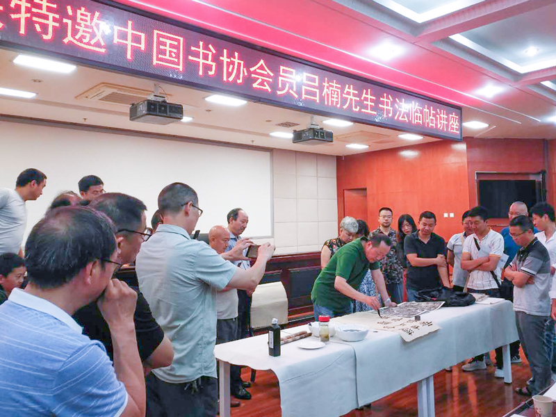 在3個(gè)小時(shí)的講座中,呂楠剖析了當(dāng)前書壇發(fā)展形勢,并結(jié)合自身對(duì)書法的實(shí)踐與感悟,針對(duì)書法科學(xué)訓(xùn)練方法、書法臨摹與創(chuàng)作的心得體會(huì),向各位書法愛好者進(jìn)行了分享。同時(shí),他以《袁安碑》《石門頌》《張遷碑》《王鐸臨聖教序》《十七帖》為范本,現(xiàn)場示范和講授了篆、隸、行、草臨帖技法。這些大氣磅礴、古拙蒼勁、瀟灑飄逸的示范作品,讓書法愛好者們享受了一場視覺藝術(shù)盛宴,深入理解了臨帖方法,很大程度上解決了臨帖中存在的問題,交流現(xiàn)場氣氛熱烈。講座對(duì)提高全縣書法愛好者的理論水平、鑒賞分析能力、臨帖技能起到積極作用。