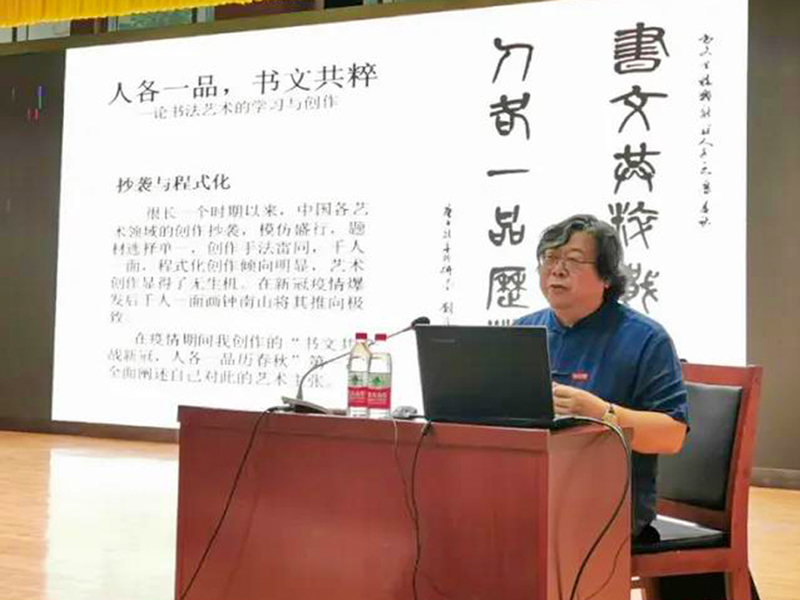 四川書法家網(wǎng)訊 6月17日下午,南充市書協(xié)主席、西華師大書法學(xué)院院長劉清揚(yáng)教授在南充師范學(xué)校作“人各一品,書文共粹——論書法藝術(shù)的學(xué)習(xí)與創(chuàng)作”主題講座。南充師范學(xué)校劉清揚(yáng)名師工作室成員、學(xué)校書畫篆刻協(xié)會(huì)的全體會(huì)員及部分愛好書法篆刻藝術(shù)的青年教師聆聽了講座。講座時(shí)長兩小時(shí)、現(xiàn)場氣氛熱烈、大家收獲頗豐。