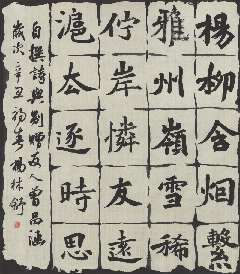 此次展覽展示了楊林舒書法作品六十余幅,作品以楊林舒擅長的楷書為主,兼示行草篆隸,其作品主要取法北碑,形式豐富多樣,整體質量高。作品內容縱覽古今,入古出新,總體分為三章:第一章為經典臨摹及創(chuàng)作,內容主要為中國古代文學經典。第二章為清風雅雨,作品內容為有關雅安的詩詞歌賦,與反映“川農大精神”的內容與文章。第三章為以古開新,內容多為楊林舒自撰的詩、文、聯作品。此外,還有反映中國特色社會主義建設的作品,如習近平同志的系列講話、脫貧攻堅主題詩及反映“抗疫阻擊戰(zhàn)詩篇”如《最美逆行者》等。重慶秀山縣書協副主席彭彬先生在作品集冊序中對楊林舒的書法贊美道:“線條飽滿、遒勁有力,流暢而不浮滑、遲澀而不僵硬;結構上茂密嚴謹,樸拙生趣;觀其章法,古今兼融,體現和諧之美,無論長短穿插、留白布空等,給人以美的享受、都細致耐品,各有風貌。”