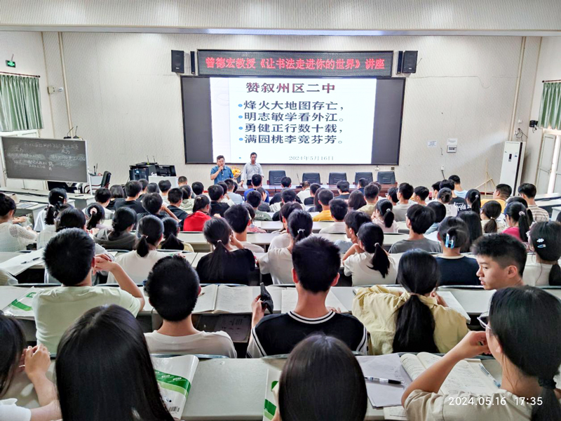 四川書法家網(wǎng)訊 5月16日下午,宜賓市書協(xié)副主席、理論與教育委員會(huì)主任、宜賓學(xué)院教授曾德宏,受邀到敘州區(qū)第二中學(xué)為師生作《讓書法走進(jìn)你的世界》講座。宜賓市書法家協(xié)會(huì)理論與教育委員會(huì)委員、敘州區(qū)教育和體育局局長聶濤,敘州區(qū)教育和體育局辦公室黨務(wù)主任伍洲,中國書法家協(xié)會(huì)會(huì)員、四川大學(xué)謝和平院士助理?xiàng)铌?,宜賓一墨書院院長莫海軍,宜賓市詩詞楹聯(lián)家協(xié)會(huì)副主席田耕,敘州區(qū)書法家協(xié)會(huì)副主席彭成軍等及在校師生100余人聆聽本次講座。