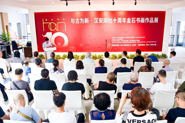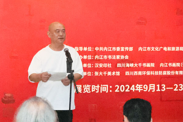 9月13日, 由中共內(nèi)江市委宣傳部、內(nèi)江市文化廣電和旅游局、內(nèi)江市文學(xué)藝術(shù)界聯(lián)合會(huì)指導(dǎo),內(nèi)江市書法家協(xié)會(huì)主辦,漢安印社、四川海峽大千書畫院、內(nèi)江書畫院(張大千書畫院)承辦,張大千美術(shù)館、四川西南環(huán)??萍挤栏煞萦邢薰?、內(nèi)蒙古森泰天然氣公司、四川中甚文旅集團(tuán)有限公司協(xié)辦的“與古為新——漢安印社十周年金石書畫作品展” 開幕式在張大千美術(shù)館舉行。