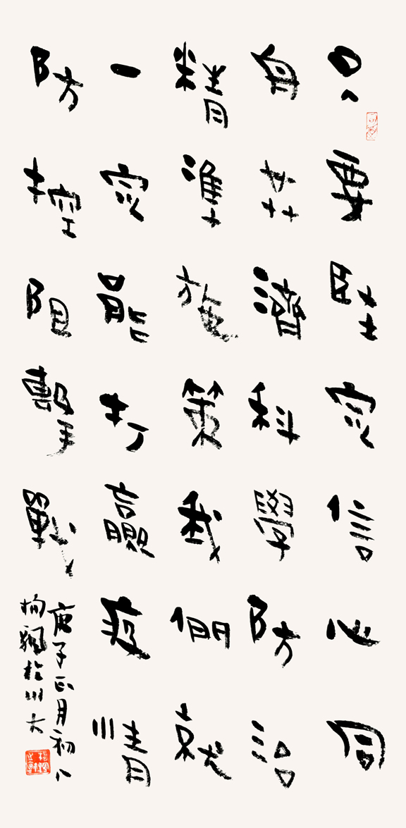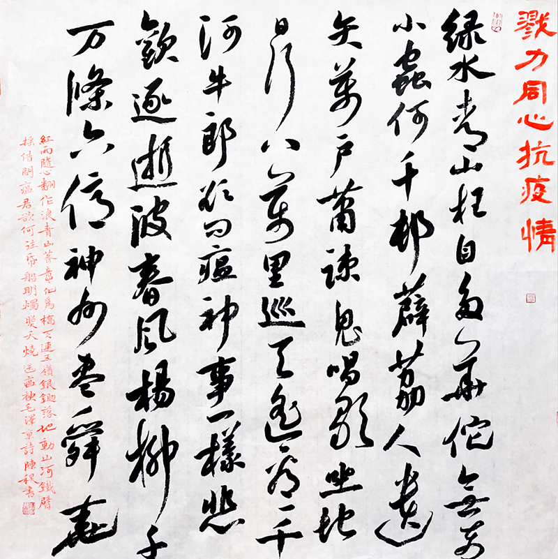 值此舉國上下奮力打贏這場(chǎng)疫情防控阻擊戰(zhàn)的關(guān)鍵時(shí)刻,四川省書法家協(xié)會(huì)迅速行動(dòng),倡議全省廣大書法家、書法組織工作者和書法愛好者積極投身到疫情防控工作中,用手中的筆墨加強(qiáng)疫情防控宣傳,創(chuàng)作出鼓舞人民斗志、凝聚人民群眾全面抗擊疫情強(qiáng)大正能量的書法作品,與全國人民一道,在這場(chǎng)抗疫防控阻擊戰(zhàn)中展現(xiàn)出四川書法人的責(zé)任和擔(dān)當(dāng),助力武漢、助力四川、助力全國戰(zhàn)勝疫情,為祖國加油。
