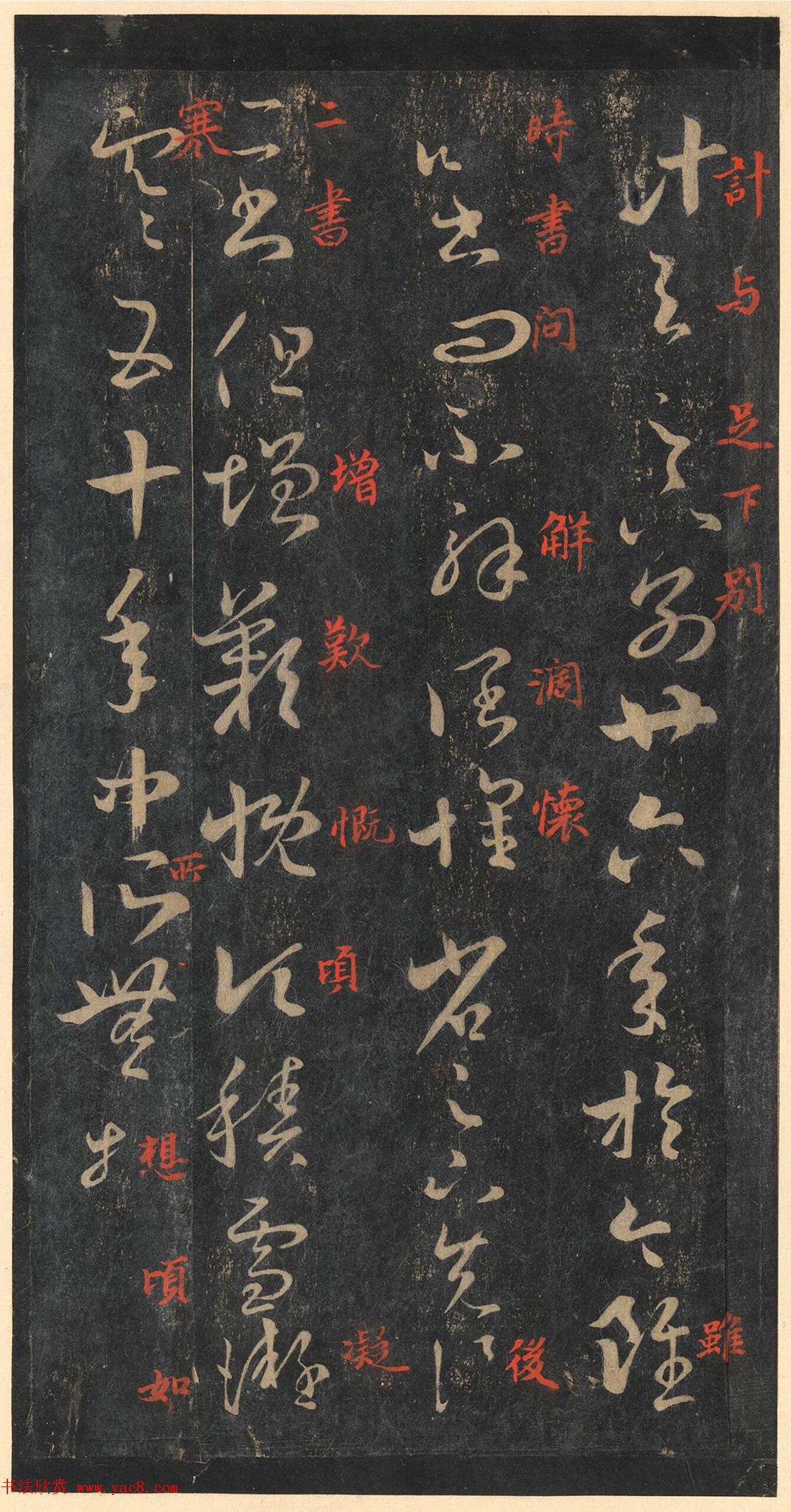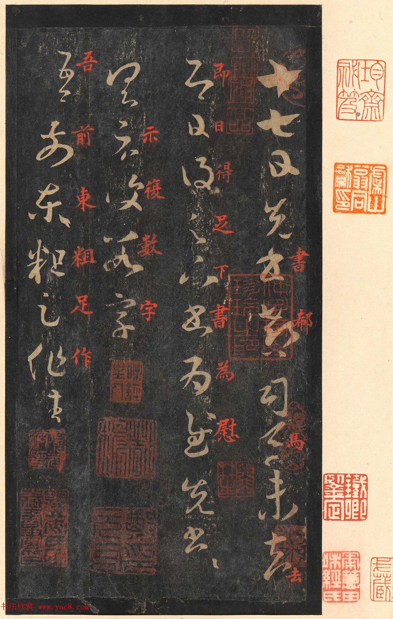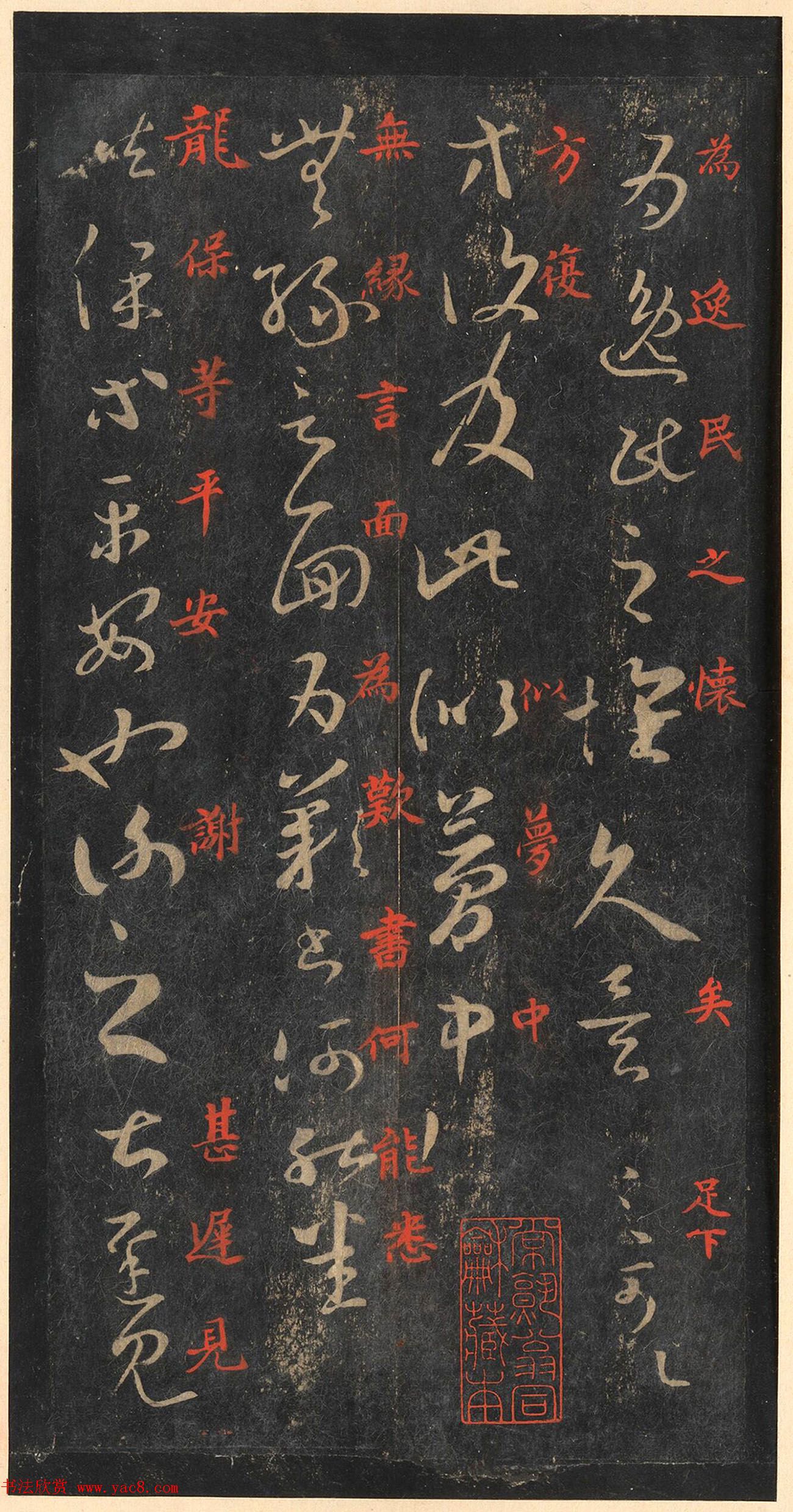屬于“館本”系統(tǒng)中的“缺十七行本”,為罕見精品拓本。本拓本摹刻傳神,字畫清晰,墨色均勻,每幅作品章法完美,同時含有朱文釋文,誠為“宋拓十七帖”諸版本中的佼佼者。