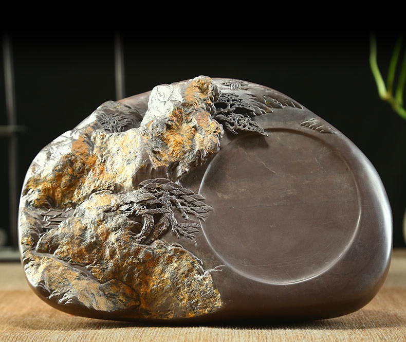 九曰硯山。依石天然形狀鑿為硯,刻石為山,叫做硯山。明高謙《遵遵生八戕》謂:"硯山始自米南宮,以南唐寶石為之,圖載《輟耕錄》,后即效之。"如天津市藝術博物館藏有清人阮元舊藏仿元人清溪釣艇小景端石硯山即是。