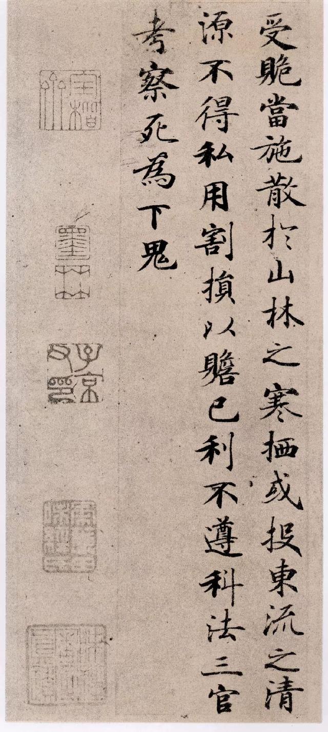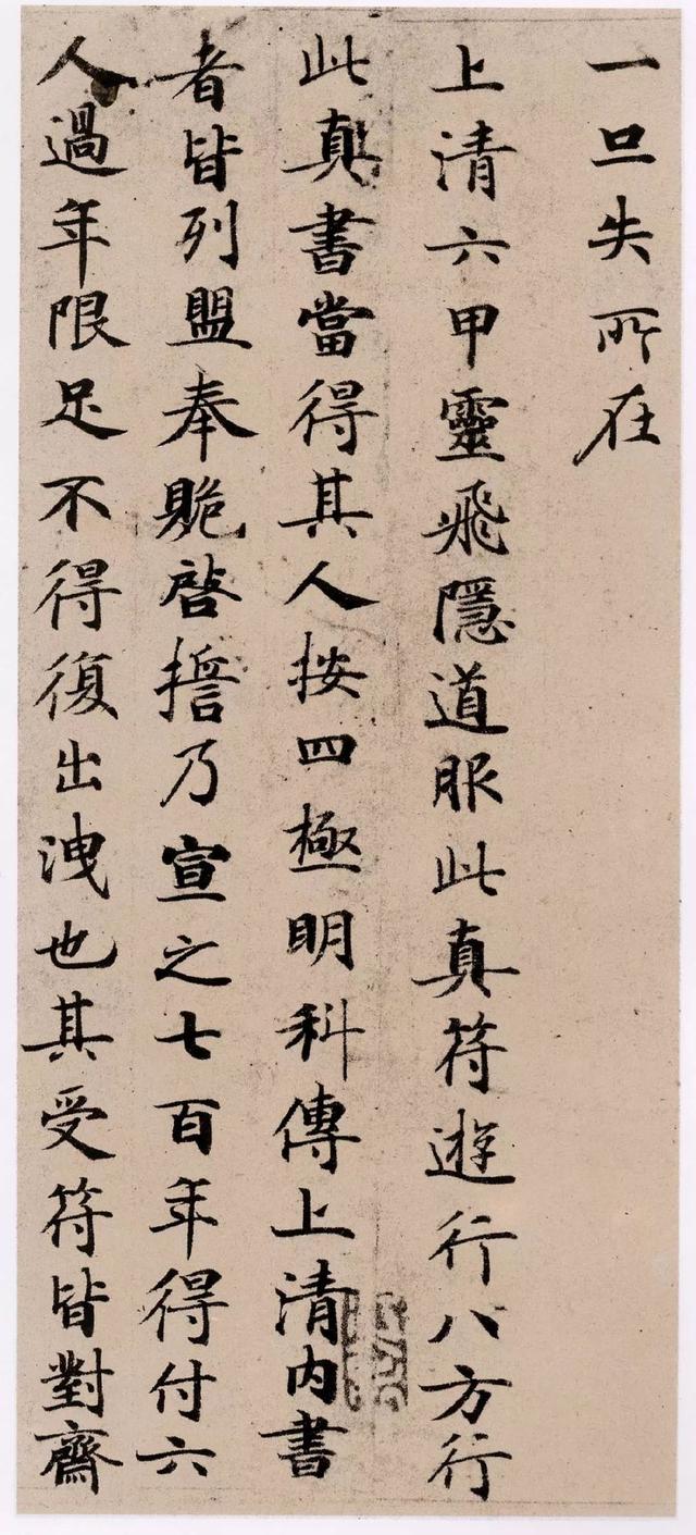 《靈飛六甲經(jīng)》一卷,唐開元間書。當(dāng)時(shí)名能書者,莫若李泰和、徐季海,然皆變習(xí)行體,獨(dú)鐘紹京守鐘王舊法。余嘗見《愛州刺史碑》、《黃庭經(jīng)》,無毫發(fā)違越。至開元間,從貶所入朝,一時(shí)字畫,皆出其手。此卷沉著遒正,知非經(jīng)生輩可到,審定為紹京無疑。