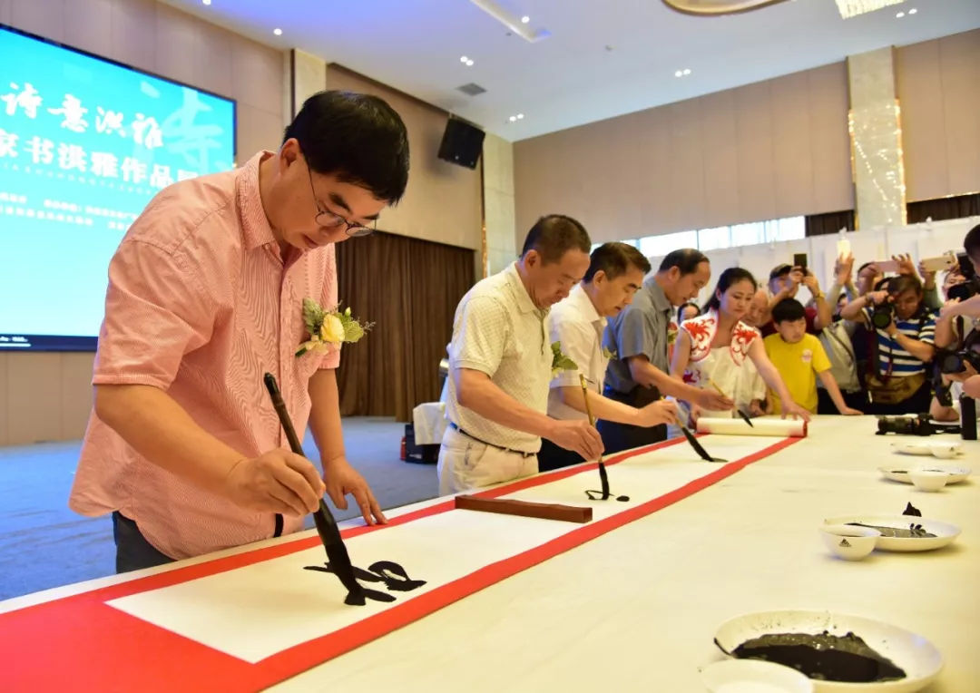 開展儀式上,戴躍、何開鑫、王七章、陳榮仲、余斌、鐘顯金、黃澤江、劉健、龔小臏、冷柏青、王書峰、楊江帆等書法名家還同臺(tái)揮毫,在長卷上現(xiàn)場書寫了“雅”字,留下了難得的墨寶。