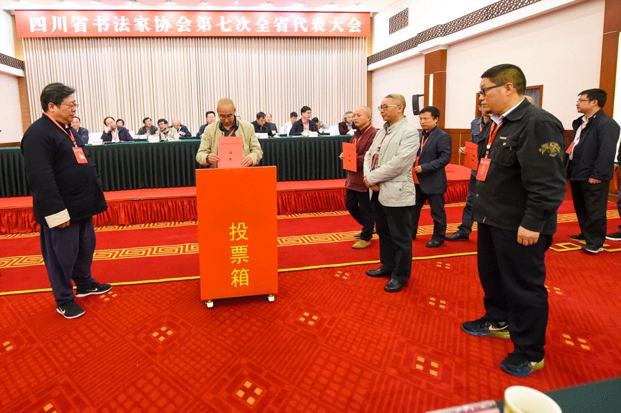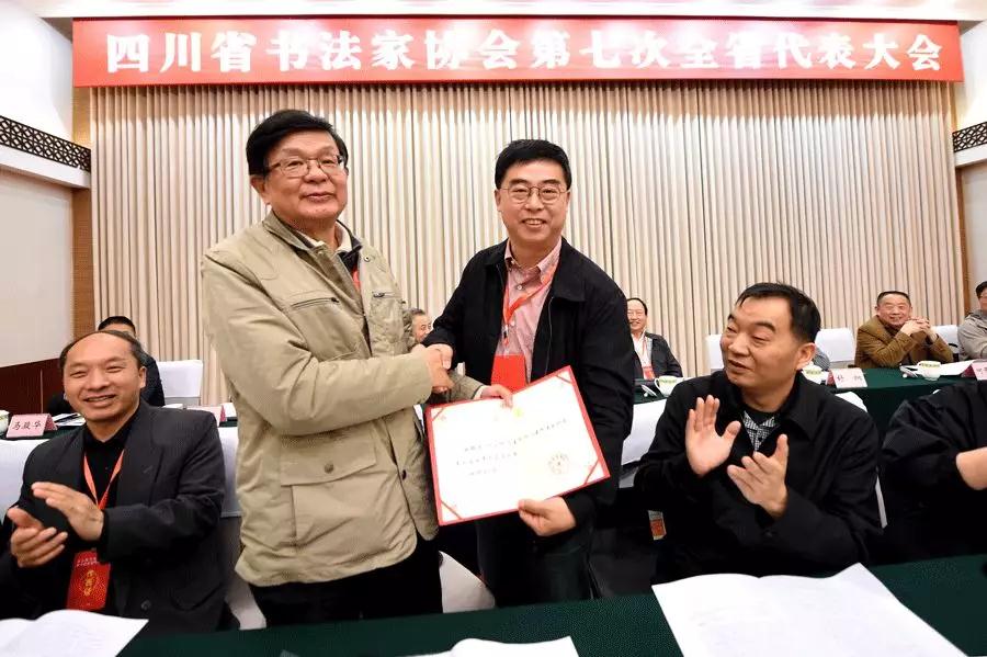 大會聽取并審議了《四川省書法家協(xié)會第七次全省代表大會工作報告》,和章程修改的說明,并進行了分組討論。下午的大會選舉產(chǎn)生了新一屆理事會和主席團,代躍當(dāng)選為四川書協(xié)主席新一屆主席,王家葵、王道義、劉健、林嶠、洪厚甜、鐘顯金、龔曉斌、黃澤江八人為副主席。經(jīng)四川省書法家協(xié)會七屆一次主席團會議研究決定,聘請何應(yīng)輝同志為四川省書法家協(xié)會第七屆名譽主席。同時聘任謝和平、王七章、舒炯、郭強、徐德松、何開鑫等著名書法家為顧問,唐昊、冷柏青、王書峰為副秘書長。