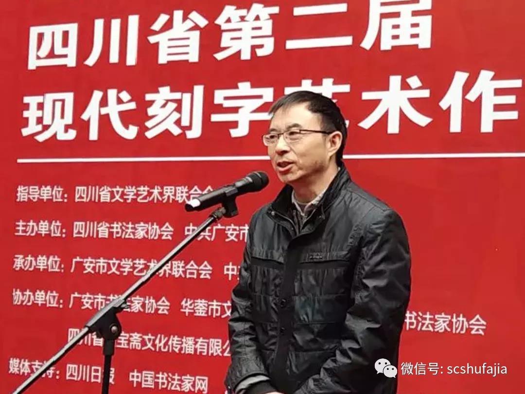 四川省書協(xié)主席戴躍代表四川省書法家協(xié)會向共同主辦該屆展覽的中共廣安市委宣傳部,承辦本屆展覽的廣安市文聯(lián)、中共華鎣市委宣傳部等單位的傾情付出表示衷心的感謝,并向本次獲獎和入展的作者表示祝賀!他說,四川現(xiàn)代刻字藝術(shù)從無到有,從小到大。2016年在廣安市文聯(lián)和華鎣市委宣傳部的共同支持與推動下,在華鎣市創(chuàng)建了四川省書協(xié)現(xiàn)代刻字藝術(shù)創(chuàng)作培訓(xùn)基地,省書協(xié)刻字委員會勇于擔(dān)當(dāng)、主動作為、加強協(xié)調(diào),積極努力在刻字基地開展了一系列的創(chuàng)作培訓(xùn)活動,對全川的現(xiàn)代刻字創(chuàng)作起到了十分重要的引領(lǐng)與推動作用。