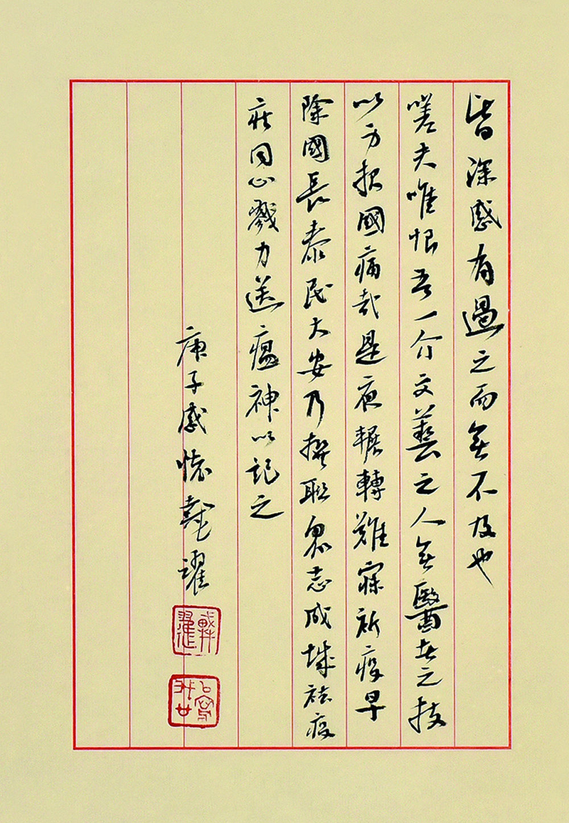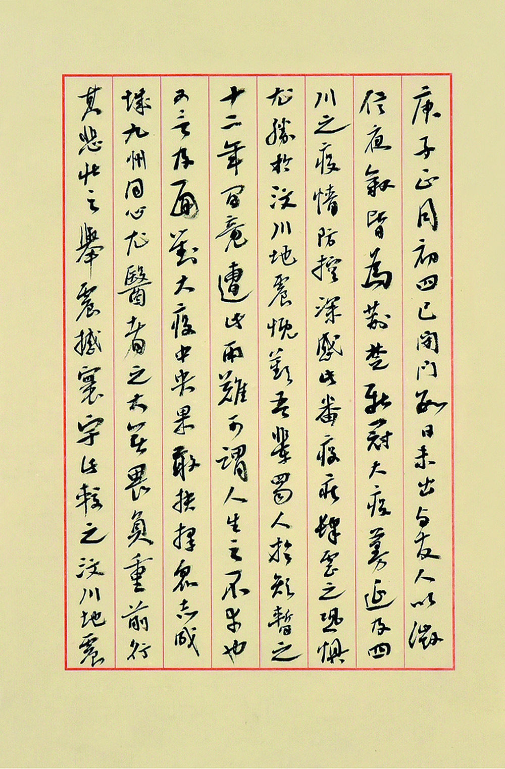 庚子正月初四,已閉門數(shù)日未出,與友人以微信夜敘,所言皆為荊楚新冠大疫蔓延及四川之疫情防控。深感此番疫疾肆虐之恐懼尤勝于『汶川地震』??畤@吾輩蜀人,于短暫之十二年間竟遭此兩難,可謂人生之不幸也。又言及面對(duì)大疫,中央果敢抉擇,眾志成城,九州同心,尤其醫(yī)者之大無(wú)畏,負(fù)重前行,其悲壯之舉,震撼寰宇,此較之汶川地震皆深感有過(guò)之而無(wú)不及。嗟夫!唯恨吾一介文藝之人無(wú)醫(yī)者之技以身報(bào)國(guó),痛哉。是夜輾轉(zhuǎn)難寐,祈疫早除,國(guó)長(zhǎng)泰,民大安!乃撰聯(lián)『眾志成城祛疫疾,同心戮力送瘟神』以記之。庚子感懷戴躍。