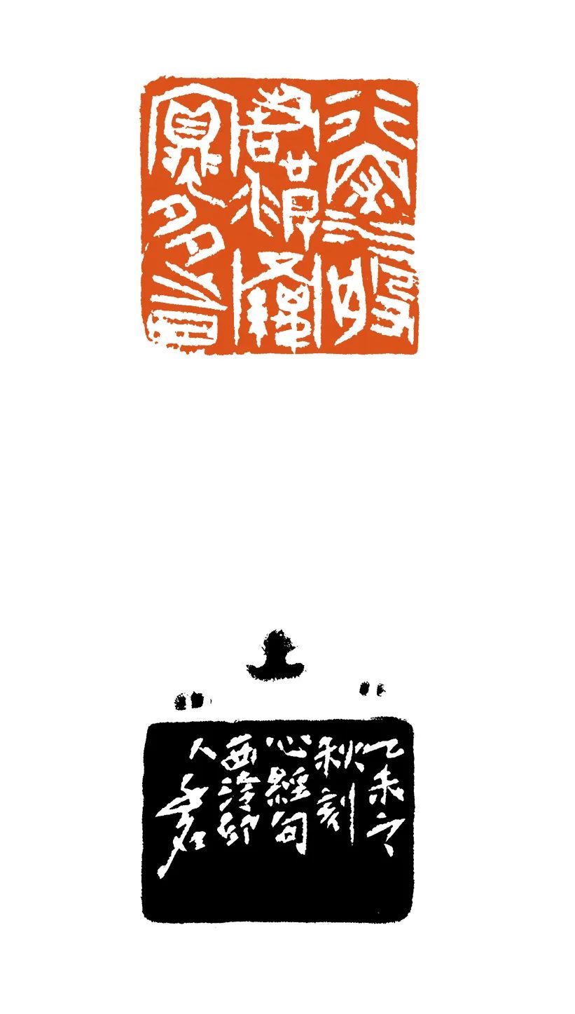 譬如作品集中首枚朱文印“般若波羅蜜多心經(jīng)”。“般若”二字斜線的律動變化;“波”字水的四個點,與左邊“經(jīng)”的三個點相呼相應(yīng);以及“羅”字結(jié)構(gòu)中的“纟”,其狀不僅與左下、右下的點成三角形引勢關(guān)聯(lián),而且其份量有如定音鼓的一記強音,敲在了整個作品節(jié)律的黃金分割點位。由此也鋪開了《心經(jīng)》全套54方印的序曲——宏大、溫婉、多變、生生不息。