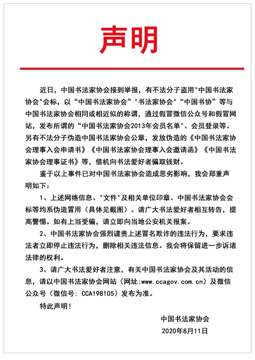 鑒于以上事件已對中國書法家協(xié)會造成惡劣影響,我會鄭重聲明如下