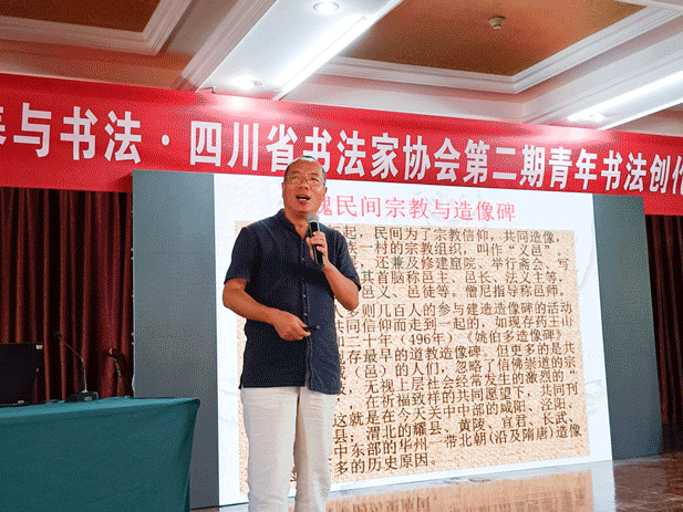 四川書(shū)法家網(wǎng)訊 8月25日上午,在中共四川省委宣傳部、四川省文聯(lián)指導(dǎo)下,四川省書(shū)法家協(xié)會(huì)主辦的“國(guó)學(xué)修養(yǎng)與書(shū)法·四川省書(shū)法家協(xié)會(huì)第二期青年書(shū)法創(chuàng)作骨干研習(xí)班”教學(xué)進(jìn)入第四天。由西安碑林博物館研究員、西泠印社社員、終南印社副社長(zhǎng)、《中國(guó)金石》編委陳根遠(yuǎn)主講《中國(guó)古代碑刻種類(lèi)、名品及碑帖鑒定》。