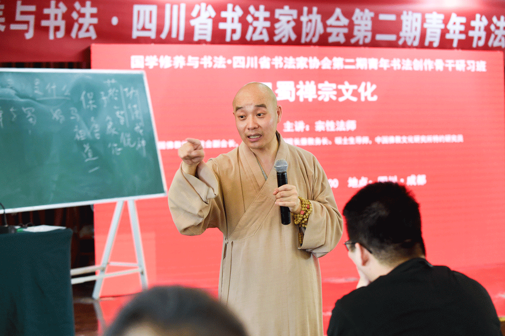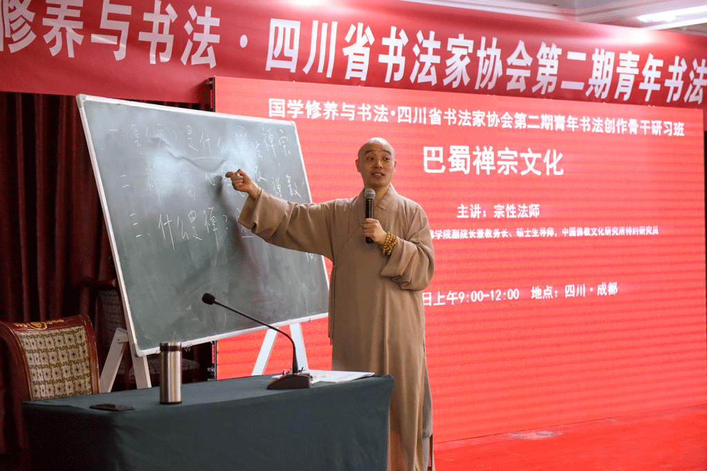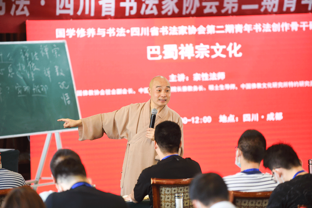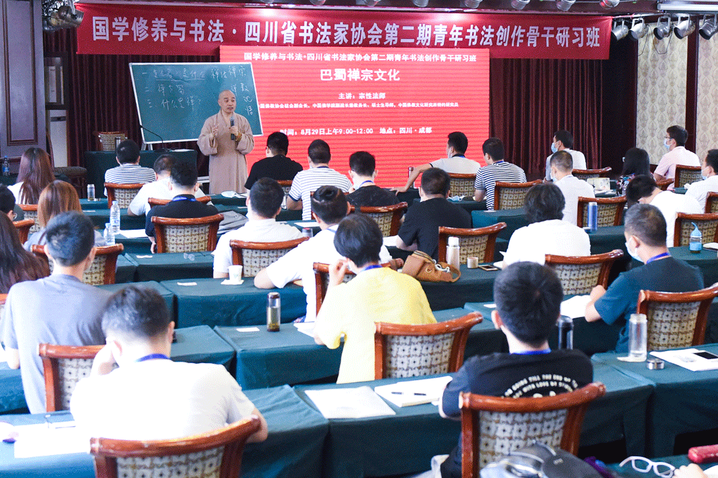 四川書(shū)法家網(wǎng)訊 8月29日,在中共四川省委宣傳部、四川省文聯(lián)指導(dǎo)下,四川省書(shū)法家協(xié)會(huì)主辦的“國(guó)學(xué)修養(yǎng)與書(shū)法·四川省書(shū)法家協(xié)會(huì)第二期青年書(shū)法創(chuàng)作骨干研習(xí)班”教學(xué)進(jìn)入第8天。中國(guó)佛教協(xié)會(huì)駐會(huì)副會(huì)長(zhǎng),中國(guó)佛學(xué)院常務(wù)副院長(zhǎng)兼教務(wù)長(zhǎng)、碩士生導(dǎo)師,中國(guó)佛教文化研究所特約研究員宗性法師主講《巴蜀禪宗文化》。