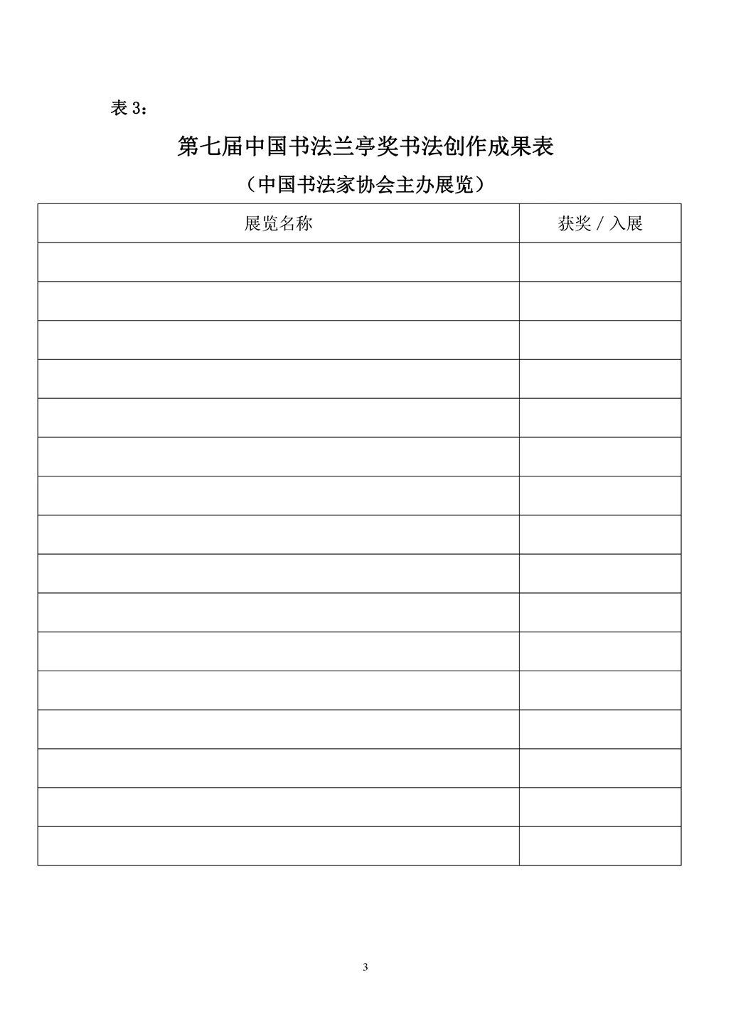 ②書法創(chuàng)作投稿作者須填寫《參評(píng)作品信息表》《書法創(chuàng)作成果表(中國(guó)書法家協(xié)會(huì)主辦展覽)》《書法創(chuàng)作成果表(非中國(guó)書法家協(xié)會(huì)主辦的專業(yè)展覽,含個(gè)人展覽)》《相關(guān)書法領(lǐng)域(創(chuàng)作以外)成果表》。