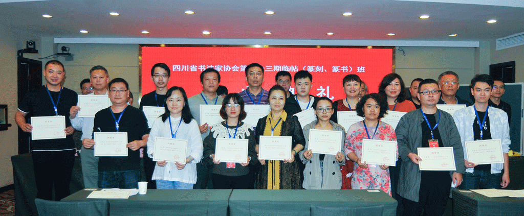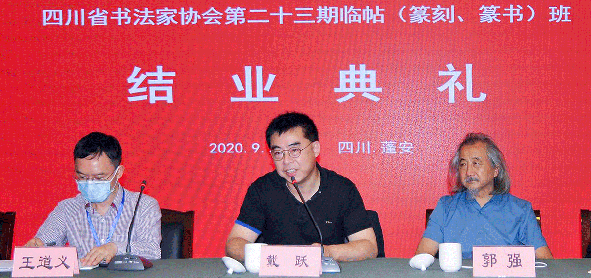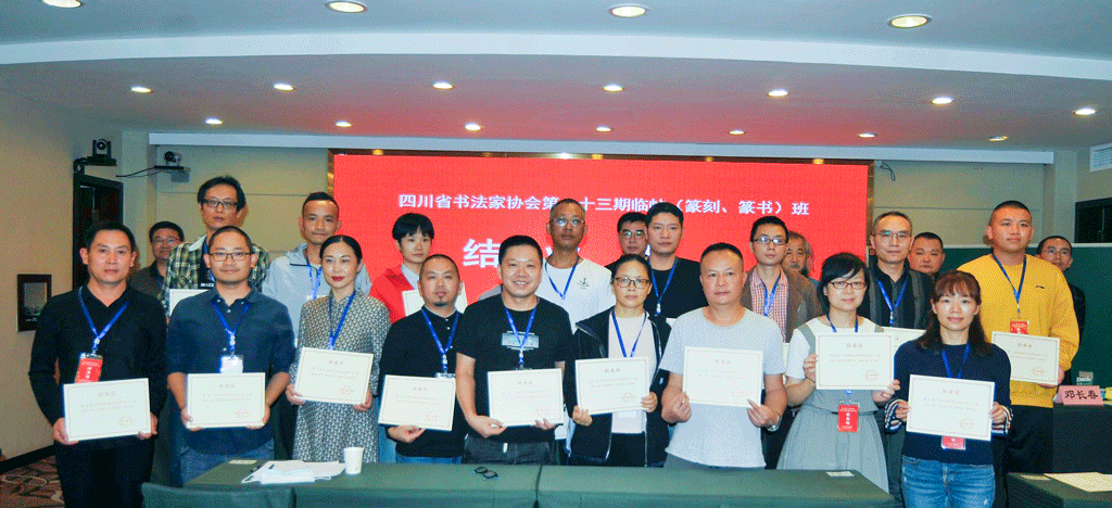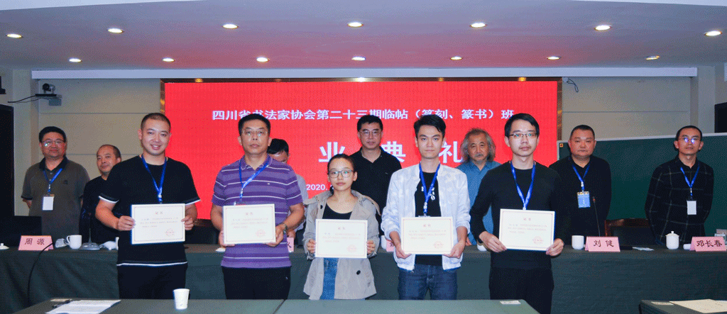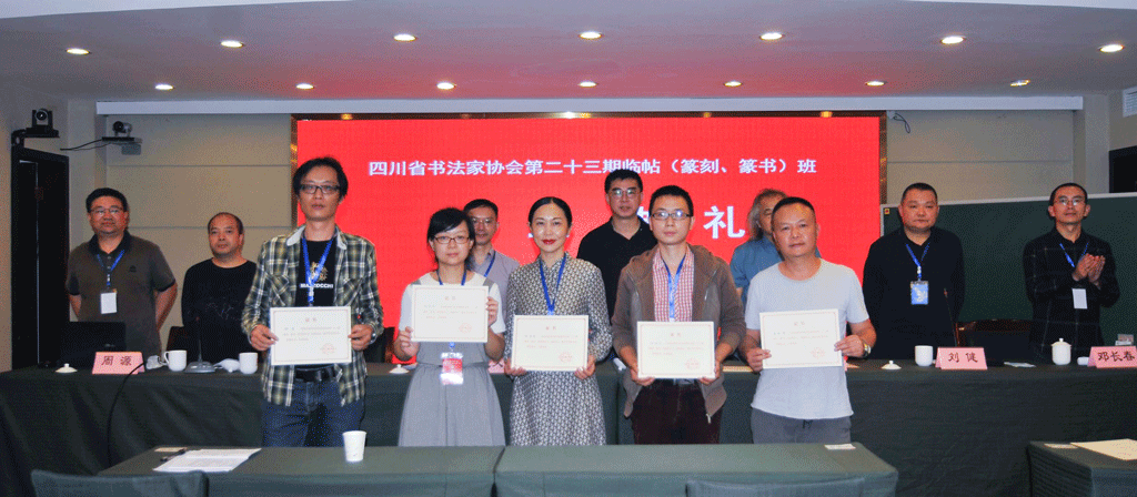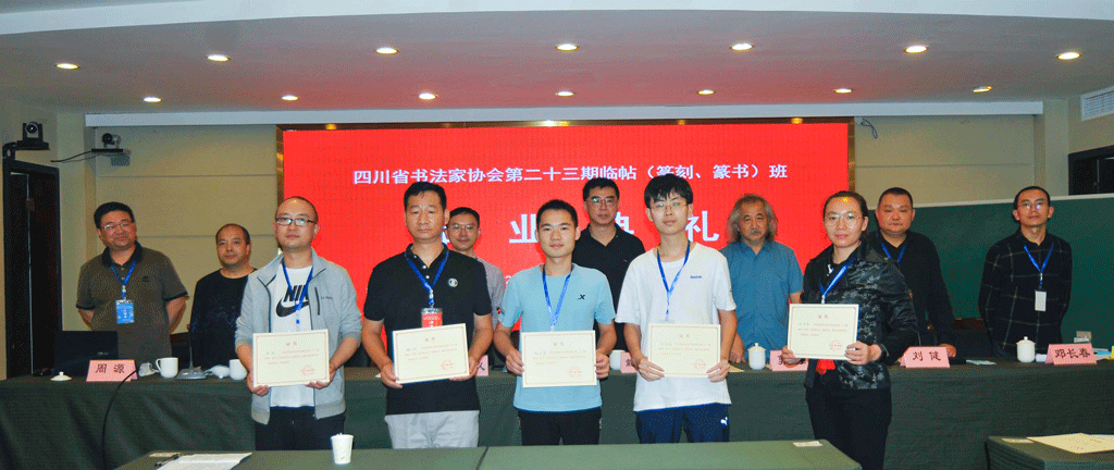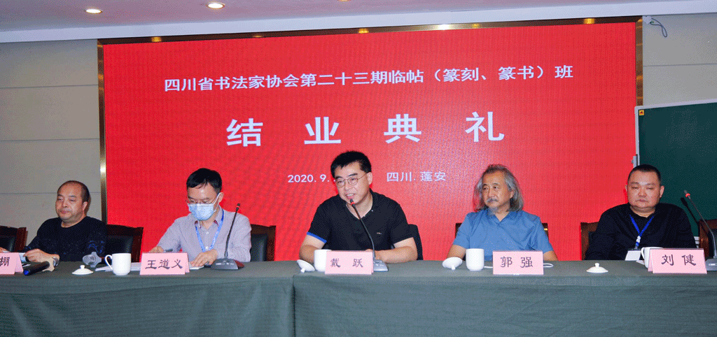 當(dāng)天晚上19:30,“四川省書(shū)法家協(xié)會(huì)第二十三期臨帖(篆刻、篆書(shū))班”舉行結(jié)業(yè)典禮。中國(guó)書(shū)法家協(xié)會(huì)理事、四川省書(shū)法家協(xié)會(huì)主席戴躍,中國(guó)書(shū)法家協(xié)會(huì)篆刻委員會(huì)委員、西泠印社理事、四川省書(shū)法家協(xié)會(huì)顧問(wèn)郭強(qiáng),四川省書(shū)法家協(xié)會(huì)副主席兼正書(shū)委員會(huì)主任、教育委員會(huì)主任、培訓(xùn)中心主任、西泠印社社員王道義,四川省書(shū)法家協(xié)會(huì)副主席兼篆刻委員會(huì)主任劉健,輔導(dǎo)教師許棚、鄧長(zhǎng)春、周源等及全體學(xué)員參加結(jié)業(yè)典禮。王道義主持結(jié)業(yè)典禮并作教學(xué)、教務(wù)等工作總結(jié)。