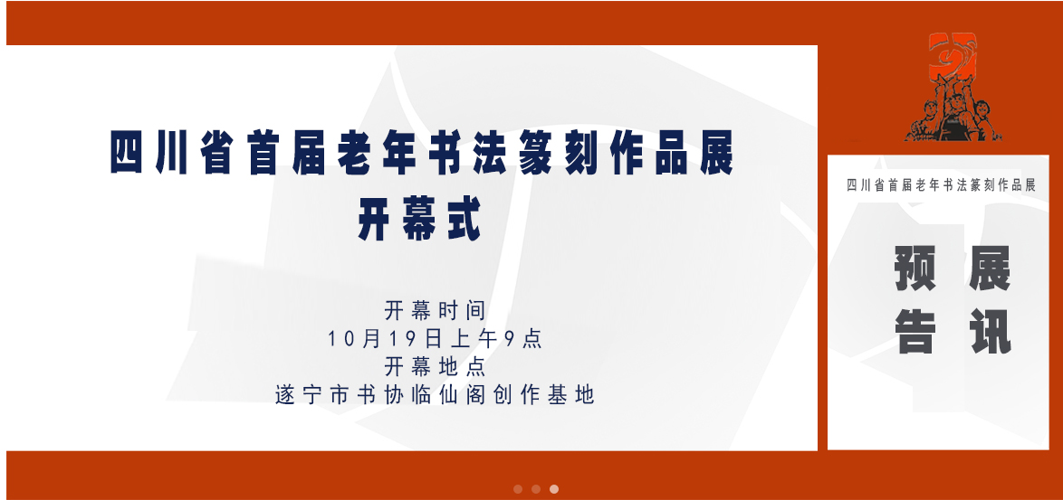 展訊預(yù)告:由四川省文學(xué)藝術(shù)界聯(lián)合會(huì)、中共四川省委老干部局指導(dǎo),四川省書(shū)法家協(xié)會(huì)、四川省老年書(shū)畫(huà)研究會(huì)、中共遂寧市委組織部、中共遂寧市委宣傳部主辦,中共遂寧市委老干部局、遂寧市文學(xué)藝術(shù)界聯(lián)合會(huì)、遂寧市書(shū)法家協(xié)會(huì)、遂寧市老年書(shū)畫(huà)研究會(huì)承辦的“四川省首屆老年書(shū)法篆刻作品展”將于10月19日上午9點(diǎn)在遂寧市臨仙閣書(shū)協(xié)創(chuàng)作基地舉行隆重開(kāi)幕儀式。