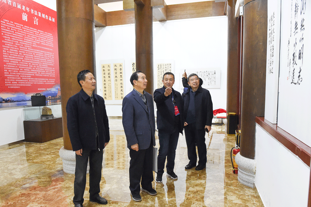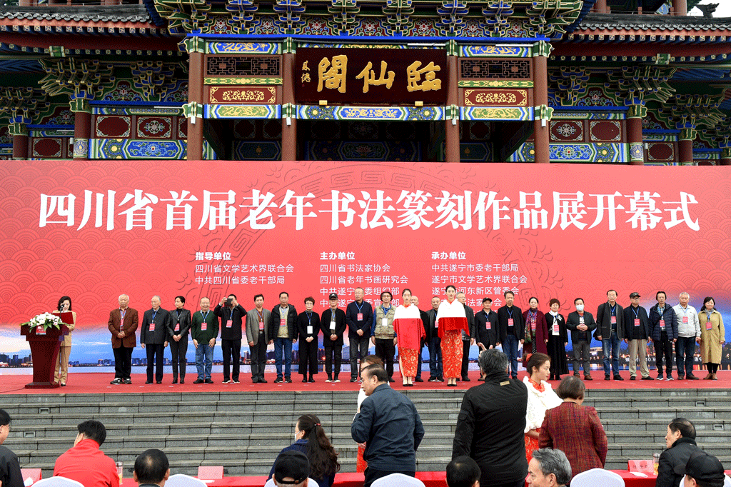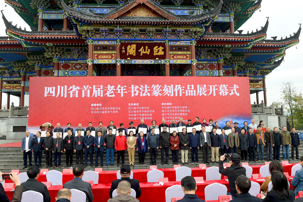 中國老年書畫研究會常務副會長兼秘書長、國家文化部直屬機關黨委原常務副書記王吉,省首屆老年書法篆刻作品展組委會主任、省政協(xié)原主席秦玉琴,省老年書畫研究會原會長、省政府原副省長徐世群,四川省政協(xié)副主席王正榮,四川省老年書畫研究會原第一副會長、省人大常委會原副主任李洪仁,四川省文學藝術界聯(lián)合會黨組書記、常務副主席平志英,四川省委老干部局二級巡視員劉亞冰,四川省文學藝術界聯(lián)合會副主席、省書法家協(xié)會主席、中國書法家協(xié)會理事戴躍,四川省老年書畫研究會會長、省委黨史研究室原主任陳榮仲,香港特別行政區(qū)對外友好協(xié)會會長、香港文聯(lián)常務副主席、四川省大熊貓國際文化藝術發(fā)展中心主任吳長江,四川省書法家協(xié)會顧問、省委老干部局原副局長、巡視員徐德松,中國書法家協(xié)會草書委員會委員、四川省書法家協(xié)會顧問何開鑫,四川省書法家協(xié)會顧問、省政府原副秘書長王七章,中國書法家協(xié)會理事、省書法家協(xié)會副主席鐘顯金,中國書法家協(xié)會行業(yè)建設委員會委員、省書法家協(xié)會副主席林嶠,省老年書畫研究會副會長,省商務廳原副廳長、巡視員李維民,省老年書畫研究會副會長、原省絲綢公司副總經(jīng)理戴朝先,原省農業(yè)廳廳長滕彩元,遂寧市委常委、組織部部長周鴻,遂寧市人大常委會黨組副書記、副主任成斌,遂寧市政協(xié)副主席、市政府副秘書長、市扶貧開發(fā)局局長勾中進,遂寧市委原書記、市人大常委會原主任熊繼堯,遂寧市老年書畫研究會會長、市人大常委會原副主任趙洪武,遂寧市老年書畫研究會原會長、市政協(xié)原副主席上官秀巍,遂寧市書協(xié)主席陳剛,四川省委老干部局、省書法家協(xié)會、省老年書畫研究會相關領導、書法家代表,各市州委老干部局、書法家協(xié)會、老年書畫研究會負責人和本屆書法篆刻作品展榮獲優(yōu)秀獎作者代表,市委老干部局、市文學藝術界聯(lián)合會、市河東新區(qū)管委會、市書法家協(xié)會、市老年書畫研究會相關負責同志,市書法家協(xié)會、市老年書畫研究會會員代表,市老年大學等及來自全省各地的書法愛好者1000余人參加開幕式并觀看展覽。