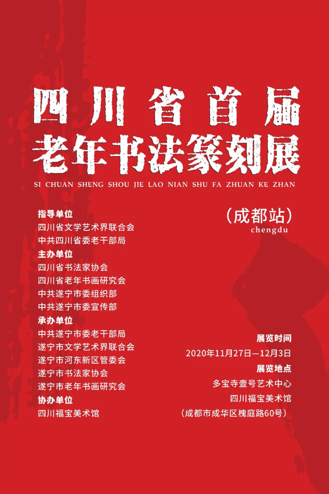 展訊: 由四川省文學(xué)藝術(shù)界聯(lián)合會(huì)、中共四川省委老干部局的共同指導(dǎo)下,由四川省書(shū)法家協(xié)會(huì)、四川省老年書(shū)畫(huà)研究會(huì)、中共遂寧市委組織部、中共遂寧市委宣傳部共同主辦的“四川省首屆老年書(shū)法篆刻作品展”將于11月27日移師四川福寶美術(shù)館展出,歡迎大家屆時(shí)前往觀展。