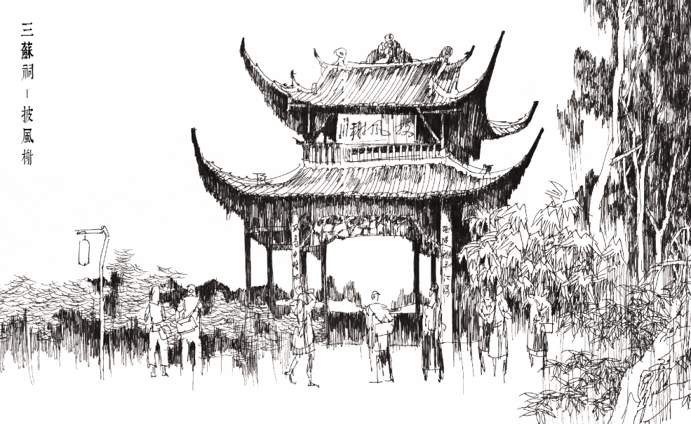 三蘇祠的房子崇高而自由。從南大門(mén)入,沿中軸線前廳、饗殿、啟賢堂、來(lái)鳳軒自南向北縱列延展,東西兩旁配以廂房,主體建筑群由此分為形制不一、程度不同、大小不等的圍合空間,或虛或?qū)?,或靜或動(dòng),或肅穆或?qū)庫(kù)o,或幽深或開(kāi)闊,我們的情緒在這變化的空間里悲喜交加、張弛有度。抱月亭、綠洲亭、瑞蓮?fù)ぁ倨峦ど⒙渌闹?,披風(fēng)榭、云嶼樓雖高兩層,卻退隱其后,不與祠宇爭(zhēng)勝。饗殿是祠堂的核心,面闊三間,進(jìn)深一間,通高9米,明間兩側(cè)為抬梁式梁架,山墻為穿斗式梁架,硬山布瓦頂。雖青瓦白墻、造型簡(jiǎn)樸,人立其前,崇高敬畏之心油然而生,如此時(shí)再響鐘鼓之聲,你可能就潸然淚下了。想見(jiàn)1665年眉州知州趙蕙芽建造此殿時(shí),一定是沐手凈心,焚香叩首,把對(duì)三蘇的仰望融進(jìn)了一磚一瓦。