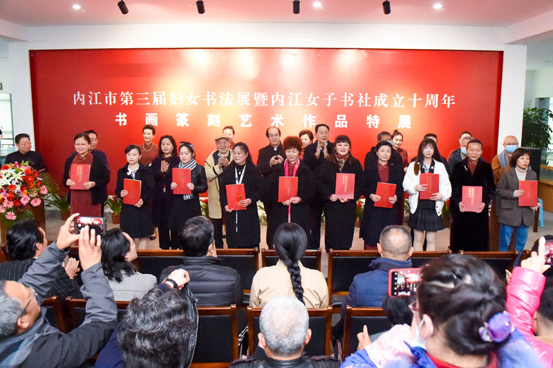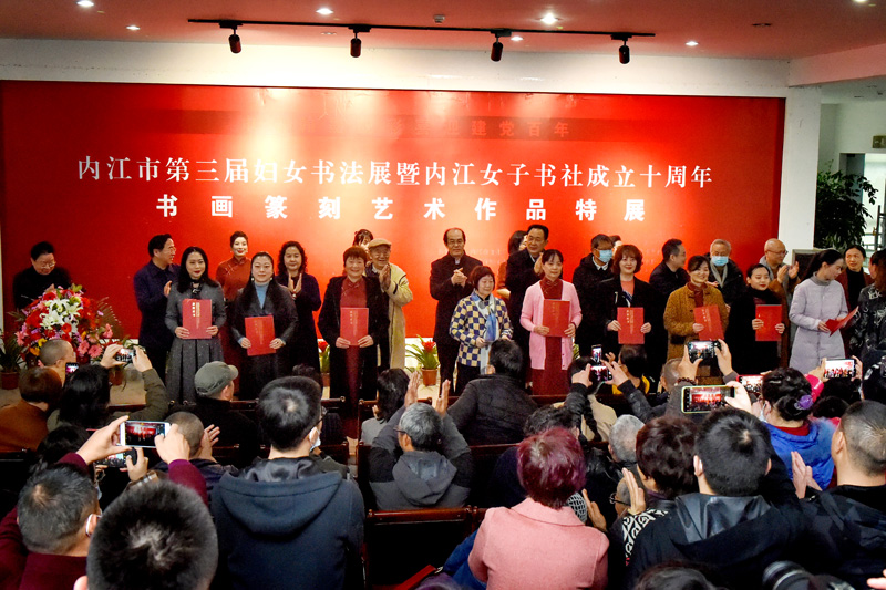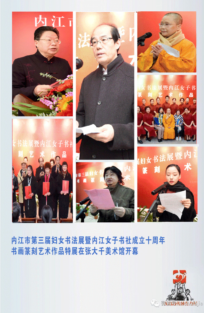 四川書法家網(wǎng)訊 3月10日,正值全國“兩會”召開之時,在喜迎建黨百年,慶祝“三八國際婦女節(jié)”之際,由內(nèi)江市婦女聯(lián)合會、內(nèi)江市文廣旅局、內(nèi)江市文聯(lián)指導(dǎo),內(nèi)江市書法家協(xié)會主辦、內(nèi)江女子書社、內(nèi)江書畫院、張大千美術(shù)館承辦的“巾幗翰墨靚彩,喜迎建黨百年”——內(nèi)江市第三屆婦女書法展暨內(nèi)江女子書社成立十周年書畫篆刻藝術(shù)作品特展在大千故里張大千美術(shù)館隆重開幕。