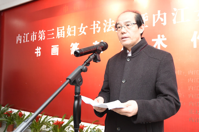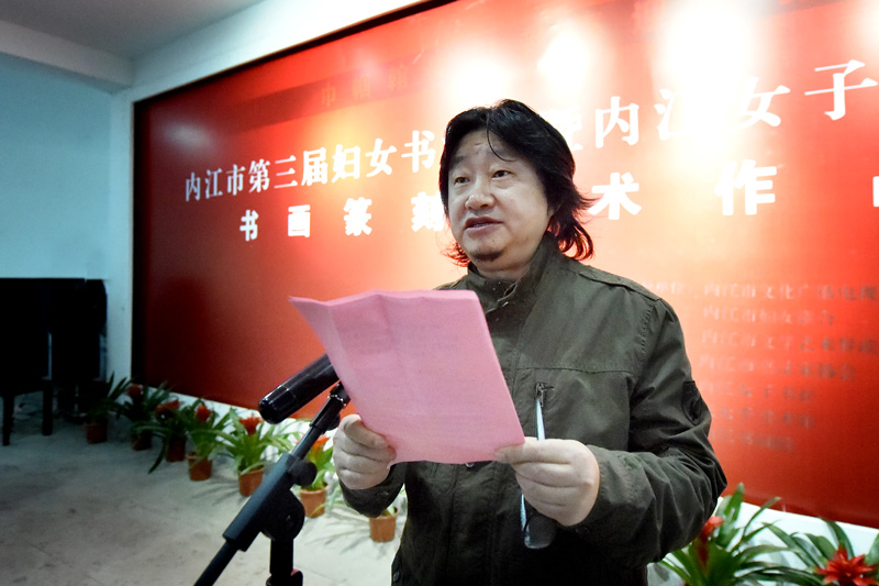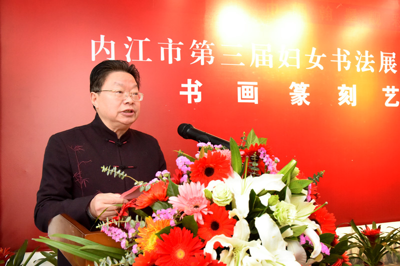 秦金保在致辭中表示,內(nèi)江古往今來,人杰地靈,人文薈萃,浸潤著深厚的歷史底蘊和豐富的文化內(nèi)涵,薪火相傳,代不乏人。尤其是內(nèi)江強(qiáng)市文化戰(zhàn)略的推進(jìn)實施,大千藝術(shù)精神的潛移黙化,大千故里一批女性書畫藝術(shù)家和愛好者,以靈巧秀麗、蕙心蘭質(zhì)交融到大千故里這片藝術(shù)熱土之上,她們醉心翰墨,情迷紙筆,以丹青言志,以翰墨抒情,匯成一幅春天詩畫,謳歌建黨百年,謳歌新時代,不僅豐富了市民文化生活,也為內(nèi)江文藝事業(yè)的繁榮和發(fā)展增添了新生力量,為這個特別的春天,增添了新的人文生機(jī),為大千故里藝壇吹來了一股清新之風(fēng)。