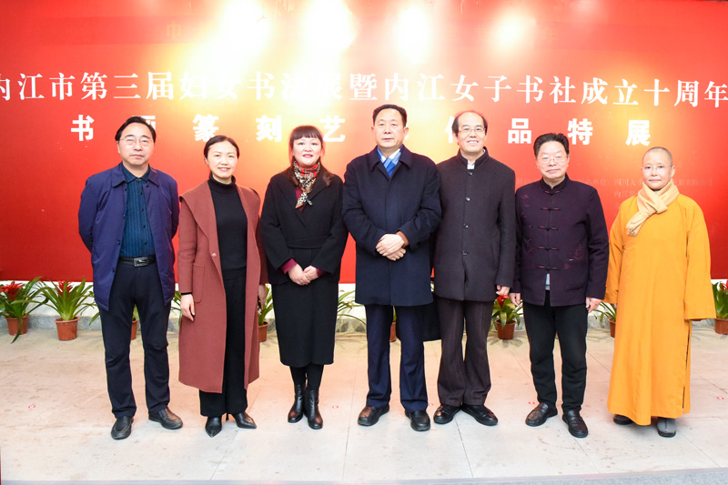內(nèi)江市人大常委會副主任、市文聯(lián)主席秦金保,內(nèi)江市委原常委、宣傳部長、內(nèi)江市老年書畫研究會會長黃忠,內(nèi)江市政協(xié)原副主席、內(nèi)江女子書社顧問楊達(dá)明,內(nèi)江師范學(xué)院原黨委副書記、教授、內(nèi)江市書協(xié)顧問張篤行,內(nèi)江市婦女聯(lián)合會副主席夏紅麗,內(nèi)江市委宣傳部一級調(diào)研員江建軍,內(nèi)江市紀(jì)委派駐市委宣傳部紀(jì)檢組組長吳彬彬,內(nèi)江市委第二巡視組組長葉自明,內(nèi)江市文聯(lián)黨組書記、張大千紀(jì)念館館長高斌,內(nèi)江市政協(xié)原副秘書長、內(nèi)江女子書社顧問鐘俊峰,內(nèi)江市書法家協(xié)會名譽主席、內(nèi)江書畫院、內(nèi)江女子書社藝術(shù)顧問李果青,內(nèi)江市婦女聯(lián)合會發(fā)展部長黃元芳,內(nèi)江圣水寺方丈、內(nèi)江圣水禪林書畫院長、內(nèi)江女子書社顧問智海師傅,內(nèi)江高峰寺住持、內(nèi)江市書法家協(xié)會女子專委員會主任兼內(nèi)江女子書社社長本凈師傅,內(nèi)江市美術(shù)家協(xié)會主席張強(qiáng),張大千美術(shù)館館長楊清秀,內(nèi)江師范學(xué)院張大千美術(shù)學(xué)院院長羅凱,內(nèi)江職業(yè)技術(shù)學(xué)院藝術(shù)系主任、內(nèi)江市美術(shù)家協(xié)會副主席郭強(qiáng),內(nèi)江美術(shù)家協(xié)會副主席、內(nèi)江女子書社藝術(shù)顧問陳爾云,內(nèi)江市美術(shù)家協(xié)會副主席兼秘書長田心偉,內(nèi)江市書法協(xié)會副主席兼秘書長劉柱,內(nèi)蒙古森泰天然氣有限公司副總經(jīng)理劉新民,內(nèi)江市書協(xié)主席團(tuán)成員、內(nèi)江市美協(xié)、內(nèi)江書畫院、內(nèi)江政協(xié)書畫院、內(nèi)江市老年書畫研究會、張大千美術(shù)學(xué)院部分師生代表、本次入展作者、獲獎代表和媒體記者代表共二百余人參加開幕式。