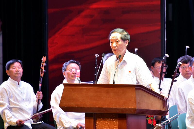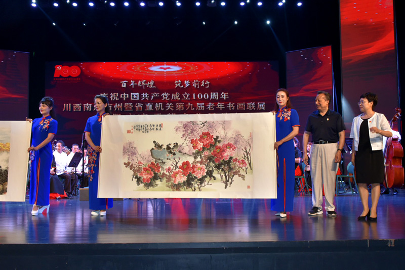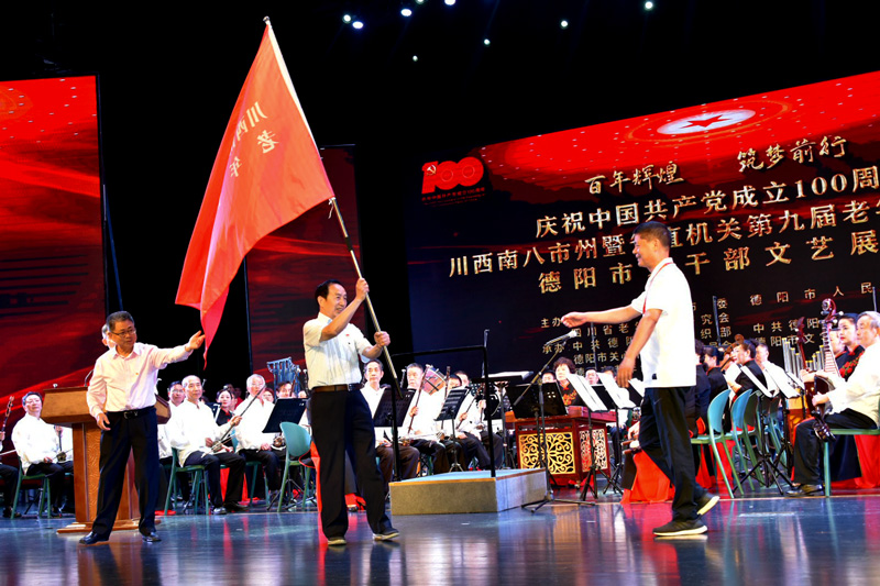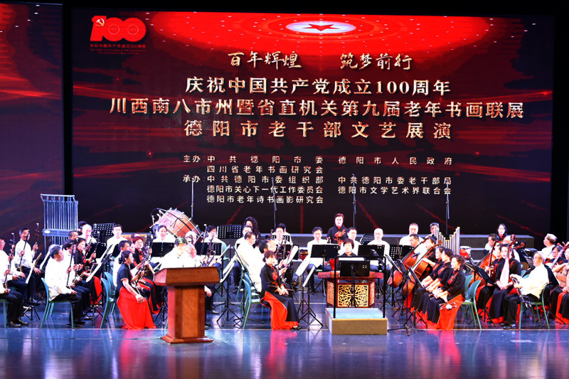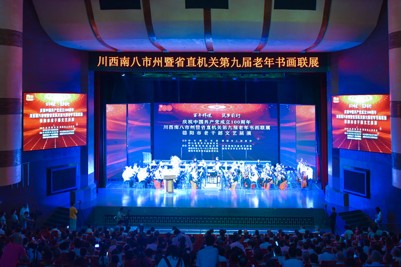 開幕式前,由德陽市老干部唱主角的《百年輝煌,筑夢前行》的文藝演出在德陽市演藝中心隆重舉行。(四川省老年書畫研究會 許莉 武蜀西)