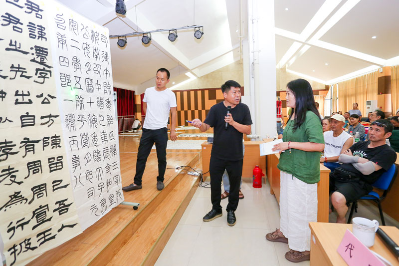 下午,在文藝中心學(xué)術(shù)報(bào)告廳開展針對(duì)中國書協(xié)“第九屆中國書壇新人新作展覽”、四川省書協(xié)“傳承與創(chuàng)新·四川省第四屆臨書臨印展”等展覽活動(dòng)備稿的看稿交流會(huì)。來自德陽四縣(市)二區(qū)的骨干作者和愛好者200余人齊聚一堂,作品五體兼?zhèn)?、琳瑯滿目,依次在展示板上貼出。代躍、王道義、林嶠針對(duì)作者全部作品,從筆法、結(jié)字、墨法、章法、文本、氣韻、書寫材料、印章使用等方面進(jìn)行細(xì)致深入的點(diǎn)評(píng),提出改進(jìn)提高意見。大家紛紛表示,參加這次活動(dòng)受益匪淺,這是對(duì)德陽地區(qū)書法篆刻精進(jìn)的一次有力推動(dòng)。