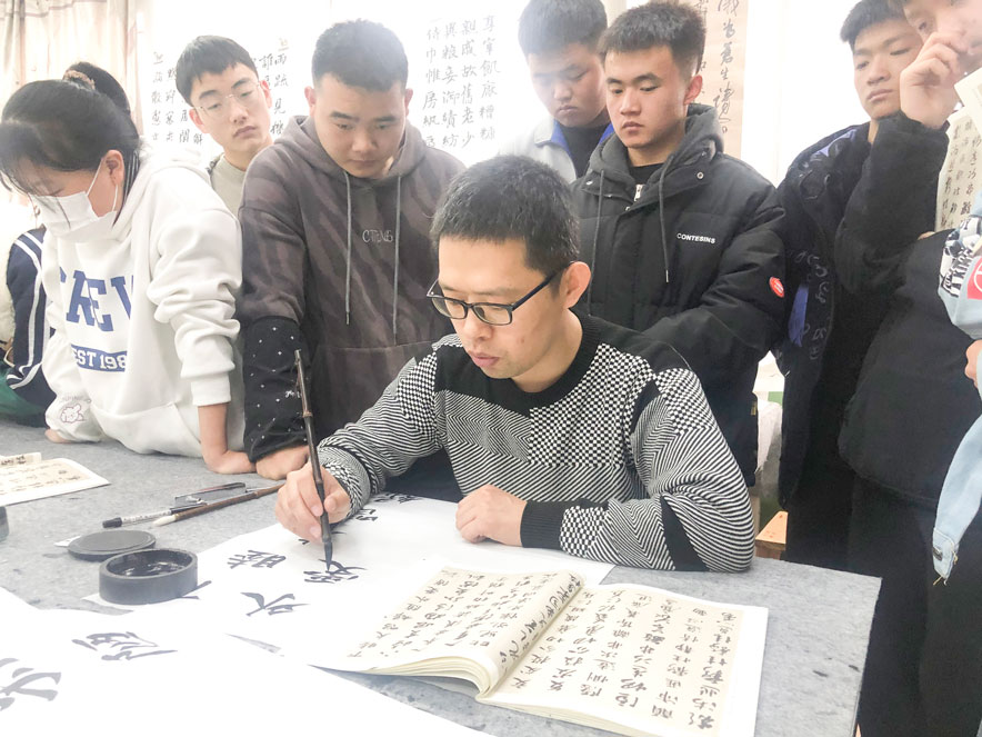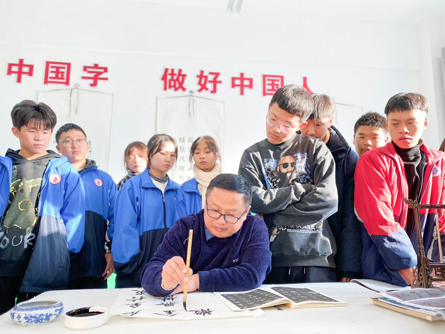 王書峰在武都實驗中學(xué)、兩水中學(xué)、八一中學(xué)分別做了《關(guān)于書法高考的意義與準備——兼及對未來方向的展望》的講座,根據(jù)自身教學(xué)經(jīng)驗,對高考策略、臨創(chuàng)關(guān)系、書法專業(yè)未來發(fā)展前景進行了系統(tǒng)講解與分析。高運剛根據(jù)自身求學(xué)經(jīng)歷、學(xué)書經(jīng)驗,對如何進行書法備考進行了細致指導(dǎo)。通過授課,讓同學(xué)們了解到書法藝術(shù)和學(xué)科的優(yōu)勢,堅定了勇往直前的信心。此外,兩位支教教師還將當?shù)貢ń處煹妮o導(dǎo)幫扶工作也納入工作重點,鼓勵他們開拓眼界、完善教學(xué)、技道并重、勇于擔(dān)當,鼓勵他們進一步努力深造,提升自身的專業(yè)水平,起到以點帶面的引領(lǐng)示范作用。