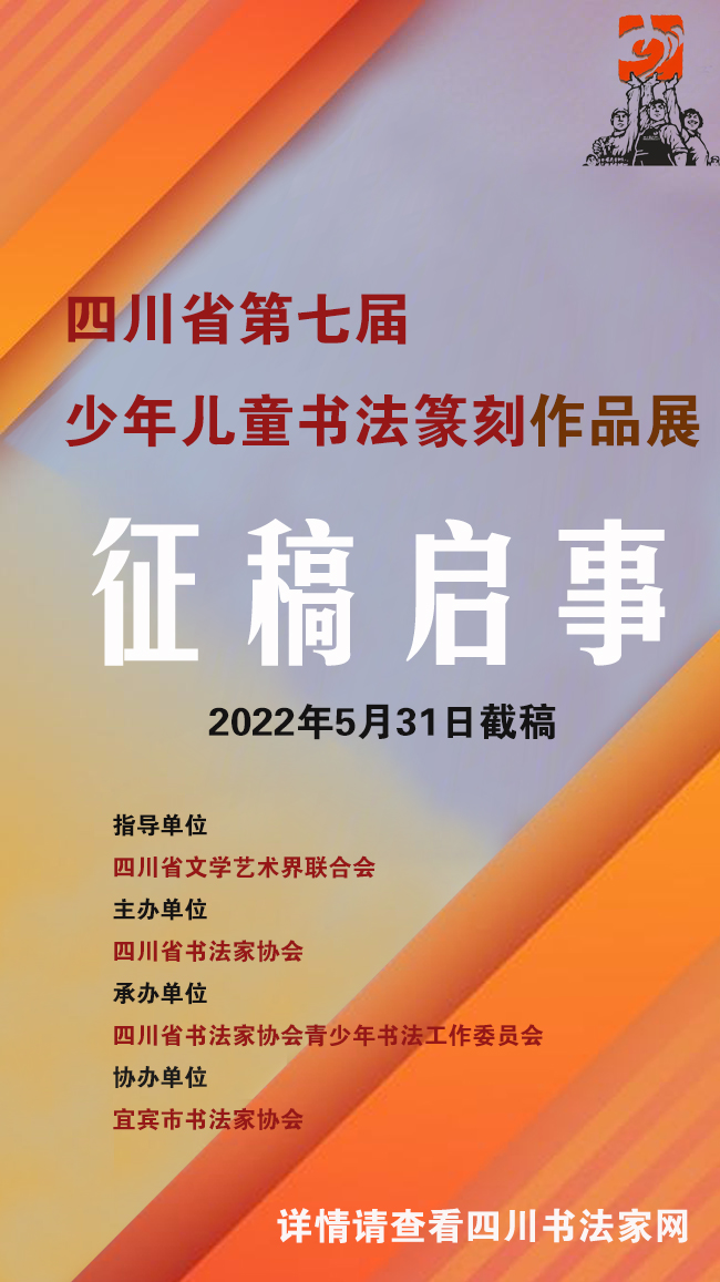 少年強(qiáng)則國強(qiáng)。當(dāng)代中國少年兒童是實(shí)現(xiàn)第一個(gè)百年奮斗目標(biāo)的經(jīng)歷者、見證者,是實(shí)現(xiàn)第二個(gè)百年奮斗目標(biāo)、建設(shè)社會(huì)主義現(xiàn)代化強(qiáng)國的生力軍,也是中華優(yōu)秀傳統(tǒng)文化的傳承人。為落實(shí)習(xí)近平總書記關(guān)于少年兒童成長重要講話精神和國家兩辦下發(fā)的《關(guān)于全面加強(qiáng)和改進(jìn)新時(shí)代學(xué)校美育工作意見的通知》有關(guān)精神,進(jìn)一步弘揚(yáng)中華優(yōu)秀傳統(tǒng)文化,以美樹人,以美育人,全面展示當(dāng)代四川少年兒童書法篆刻的藝術(shù)素養(yǎng),進(jìn)一步促進(jìn)和繁榮四川省少年兒童書法篆刻藝術(shù)創(chuàng)作與教育教學(xué)水平,經(jīng)研究決定舉辦“四川省第七屆少年兒童書法篆刻作品展”?,F(xiàn)將征稿有關(guān)事項(xiàng)公布如下: