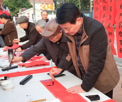 展覽活動現(xiàn)場,廣大書法家們還為市民免費寫春聯(lián)200余幅,贈送“福”字300多幅。縣委組織部常務副部長、縣委老干部局局長朱敏育、縣委宣傳部常務副部長雷宇、縣委宣傳部副部長嚴玉親自參觀展覽并向騎龍鎮(zhèn)、獅市鎮(zhèn)、富世街道沙山社區(qū)和江陽磁材公司等六個單位贈送春聯(lián)和“福”字作品300多幅。
