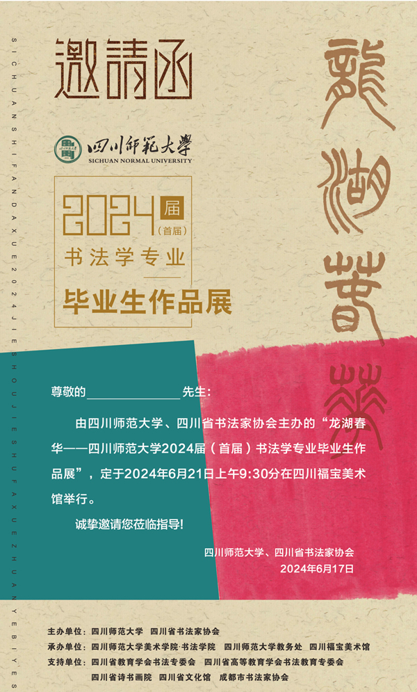 由四川師范大學(xué)、四川省書法家協(xié)會主辦,四川師范大學(xué)美術(shù)學(xué)院·書法學(xué)院,四川師范大學(xué)教務(wù)處、四川福寶美術(shù)館承辦的“四川師范大學(xué)2024屆(首屆)書法學(xué)專業(yè)畢業(yè)生作品展”將于2024年6月21日上午9:30在四川福寶美術(shù)館舉行開幕式。