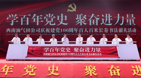 四川書法家網(wǎng)訊訊? ? 3月27日,四川省書法家協(xié)會組織書法家參加西南油氣田公司、四川省經(jīng)濟(jì)文化協(xié)會、中國石油書法家協(xié)會、四川省書法家協(xié)會在毛澤東主席視察隆昌氣礦紀(jì)念館會戰(zhàn)廣場舉辦的“學(xué)百年黨史 聚奮進(jìn)力量:西南油氣田公司慶祝建黨100周年百人百米長卷書法獻(xiàn)禮活動”。