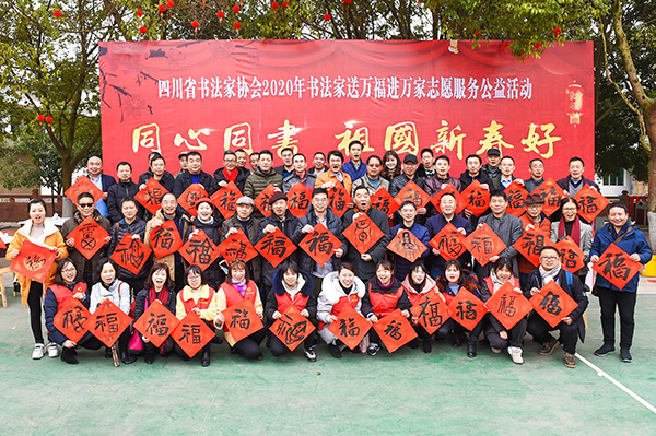 ? 1月8日,由四川省書協(xié)、洪雅縣委縣政府、眉山市文聯(lián)共同主辦的“同心同書祖國新春好”四川省書協(xié)2020年書法家送萬福進(jìn)萬家志愿服務(wù)公益活動,走進(jìn)中國有機(jī)茶第一村洪雅縣中山鎮(zhèn)前鋒村,為基層群眾贈送“?!弊趾痛郝?lián),為他們送上歡樂和新春祝福。? ?