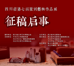 在四川省文學(xué)藝術(shù)界聯(lián)合會、中共內(nèi)江市委宣傳部、內(nèi)江市文化廣播電視和旅游局、內(nèi)江市文學(xué)藝術(shù)界聯(lián)合會等單位的指導(dǎo)支持下,四川省書法家協(xié)會決定在2020年舉辦“四川省第七屆篆刻藝術(shù)作品展”。