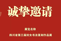 11月16日14:30,由四川省文學(xué)藝術(shù)界聯(lián)合會(huì)指導(dǎo),四川省書法家協(xié)會(huì)、中共綿陽(yáng)市委宣傳部、綿陽(yáng)市文學(xué)藝術(shù)界聯(lián)合會(huì)主辦,“四川省第三屆婦女書法篆刻作品展”將在綿陽(yáng)市博物館舉行開(kāi)幕式