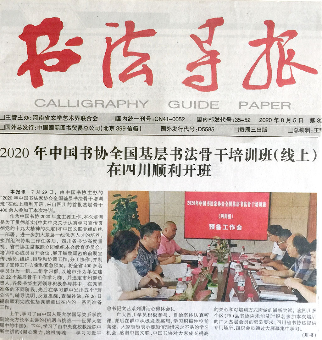 2020年8月5日,《書法導(dǎo)報(bào)》刊載《2020年中國書協(xié)全基層書法骨干培訓(xùn)班(線上)在四川順利開班》信息。