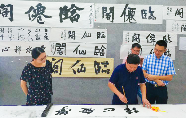 學員們在市一醫(yī)院工會主席郝維華的帶領下,參觀了市書協(xié)河東臨仙閣創(chuàng)作基地,登上臨仙閣,學習了書法家們的作品,進一步感受了書法的藝術(shù)魅力并欣賞了遂寧的涪江美景!參觀結(jié)束后,在陳剛、聶兆科、趙虎、楊慶等老師的指導下又靜心體悟了筆法、交流各自心得!老師們現(xiàn)場書寫作品贈予學員們,并合影留戀!