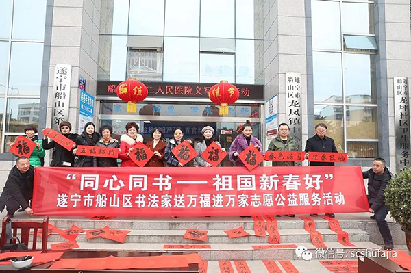 人逢盛世精神爽,年庚歲末送春聯(lián)。紅紅火火的春聯(lián)表達(dá)美好愿望、希望,使新年有個新氣象,在鼠年春節(jié)來臨之際,遂寧市船山區(qū)書法家協(xié)會到龍鳳鎮(zhèn)中心衛(wèi)生院開展“同心同書——祖國新春好”送萬福進(jìn)萬家志愿公益服務(wù)活動,弘揚傳統(tǒng)美德,傳遞愛心,把社會各界的關(guān)懷和祝福送到千家萬戶,營造節(jié)日喜慶。
