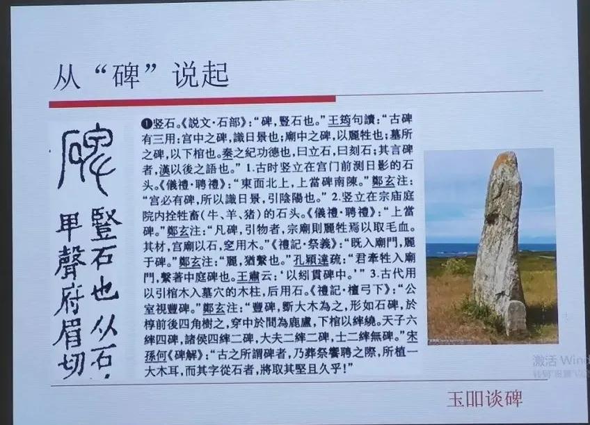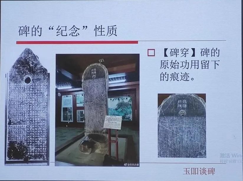 在上午的講座中,王老師以金石學(xué)與書法之間的關(guān)系為線索,為大家講授碑的起源:碑的含義有三種,一是古時(shí)候豎在宮門前測(cè)日影的石頭;二是豎立在宗廟庭院內(nèi)拴牲畜的石頭;三是古代用引棺木入墓穴的木柱,后用石。