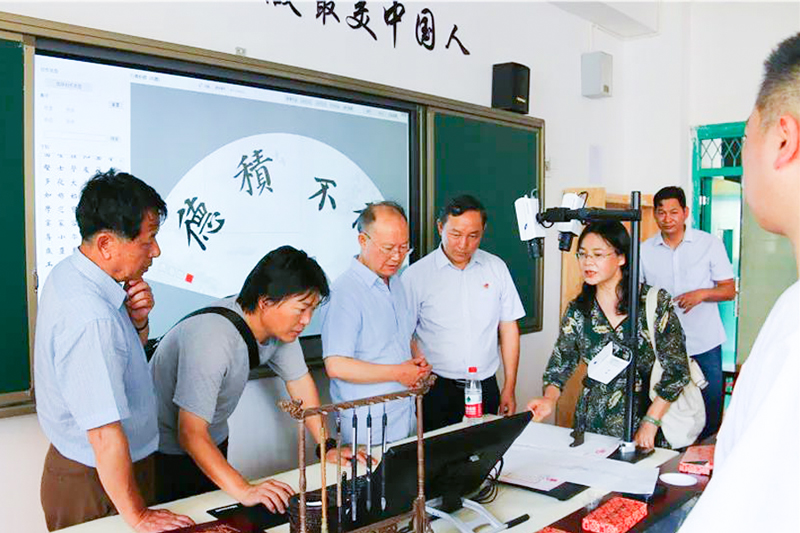 會(huì)后,書法家們參觀了學(xué)校,在“數(shù)字書法教室”,金玉全、曾光福等書法家饒有興致地觀看了老師的操作:在遵循傳統(tǒng)筆墨紙硯書法教學(xué)的前提下,引入數(shù)字信息化技術(shù)手段,實(shí)現(xiàn)了“讓書法名家走進(jìn)課堂”與“一對(duì)一教學(xué)”,使教學(xué)反饋更及時(shí),教學(xué)效果更顯著。