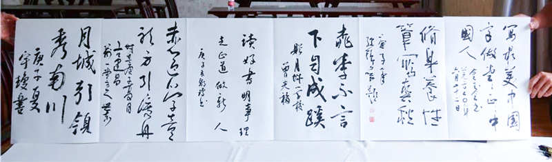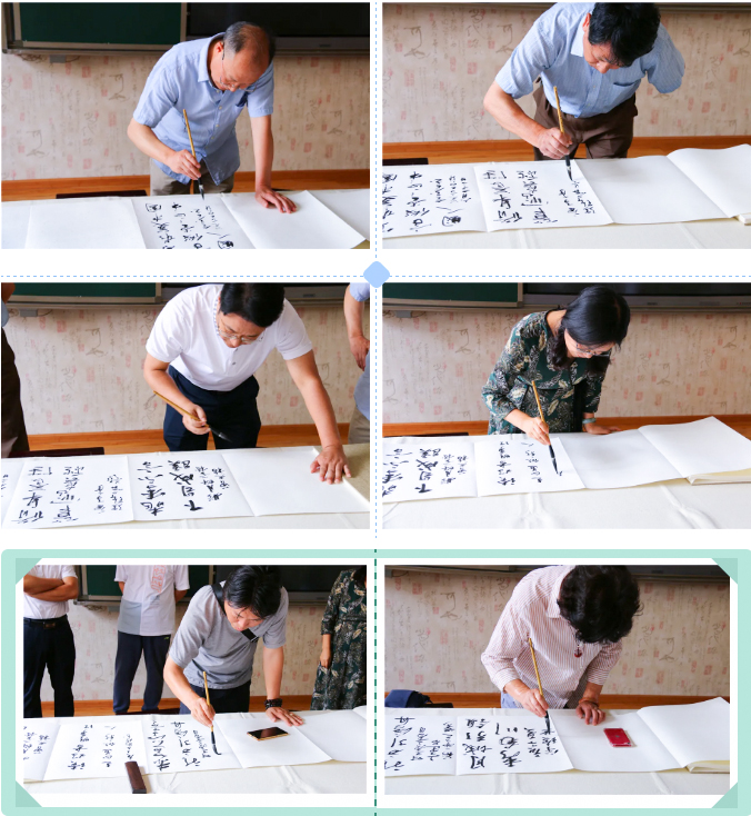 作為州、市書法家協(xié)會(huì)聯(lián)合啟動(dòng)的“首家書法教育實(shí)驗(yàn)學(xué)校”,州、市書協(xié)領(lǐng)導(dǎo)高度重視,并寄予厚望,州書協(xié)金玉全主席欣然為月城學(xué)校題詞:“寫最美中國(guó)字,做堂堂正正的中國(guó)人”;市書協(xié)曾光福主席題詞:“桃李不言,下自成蹊”;其他州、市書協(xié)領(lǐng)導(dǎo)也紛紛題詞,州書協(xié)副主席孫錦屏題詞:“修身養(yǎng)性,筆寫春秋”;州書協(xié)副主席鄢瓊題詞:“讀好書明事理,走正道做新人”;市書協(xié)副主席陳世東題詞:“赤心迎學(xué)童,躬身引渡舟”……作為月城學(xué)校的老教師龔宇瓊老師目睹老校新貌,也激動(dòng)揮毫:“月城引領(lǐng)秀南川”。