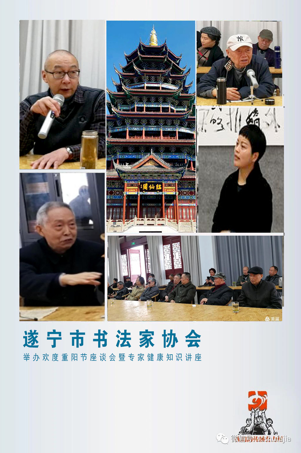 四川書法家網(wǎng)訊 陽光和煦,金桂飄香。10月23日上午,在重陽節(jié)來臨之際,遂寧市書協(xié)在河?xùn)|臨仙閣創(chuàng)作交流基地舉辦歡度重陽節(jié)座談會(huì)暨健康知識(shí)講座。遂寧市書協(xié)主席陳剛代表市書協(xié)望慰問老年書法朋友并向他們致以節(jié)日問候和良好祝愿。全市中老年書法朋友代表60余人參加。