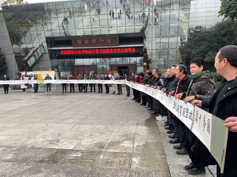 在開幕式上,書協(xié)會員以“幸福中國”為主題書寫脫貧攻堅書法長卷,大家執(zhí)筆在長卷上熱情揮灑,為雅安市的脫貧攻堅工作獻上了一曲曲贊歌。筆會結束后,所書寫的兩幅書法長卷,現(xiàn)場進行了捐贈儀,捐贈給雅安市博物館和雅安市文化館。