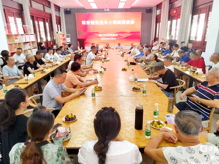 當(dāng)日,書(shū)協(xié)會(huì)議室內(nèi)高朋滿座,雖然夏日炎炎,酷暑難耐,但這依然抵擋不住大家前來(lái)祝賀的熱情。參加此次座談會(huì)的有市級(jí)老領(lǐng)導(dǎo)張宜榮、王漢東、上官秀魏、趙洪武,原遂寧縣老領(lǐng)導(dǎo)丁超群,遂寧市文學(xué)藝術(shù)界聯(lián)合會(huì)黨組書(shū)記、主席梁勤,遂寧市僑聯(lián)副主席周利民,老藝術(shù)家代表柏波、張達(dá)煜、梁敦寧,市書(shū)協(xié)主席團(tuán)成員,蔣老的親屬及其藝術(shù)界的朋友。