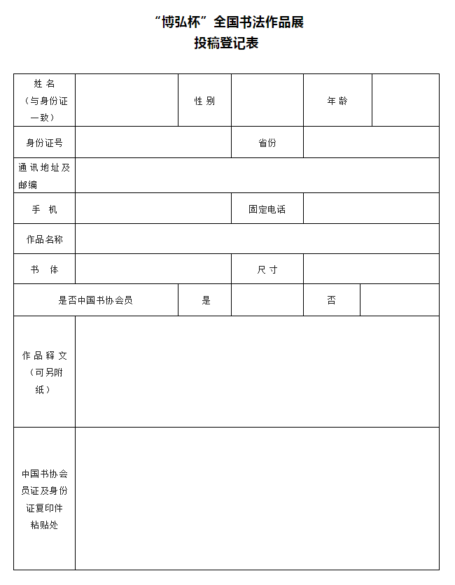 (5)①請在書法作品背后右下角用鉛筆正楷注明:作者真實姓名、性別、電話、身份證號、通訊地址、書體、作品名稱、是否中書協(xié)會員。②按要求填寫投稿登記表,隨作品一并寄至本次展覽組委會。